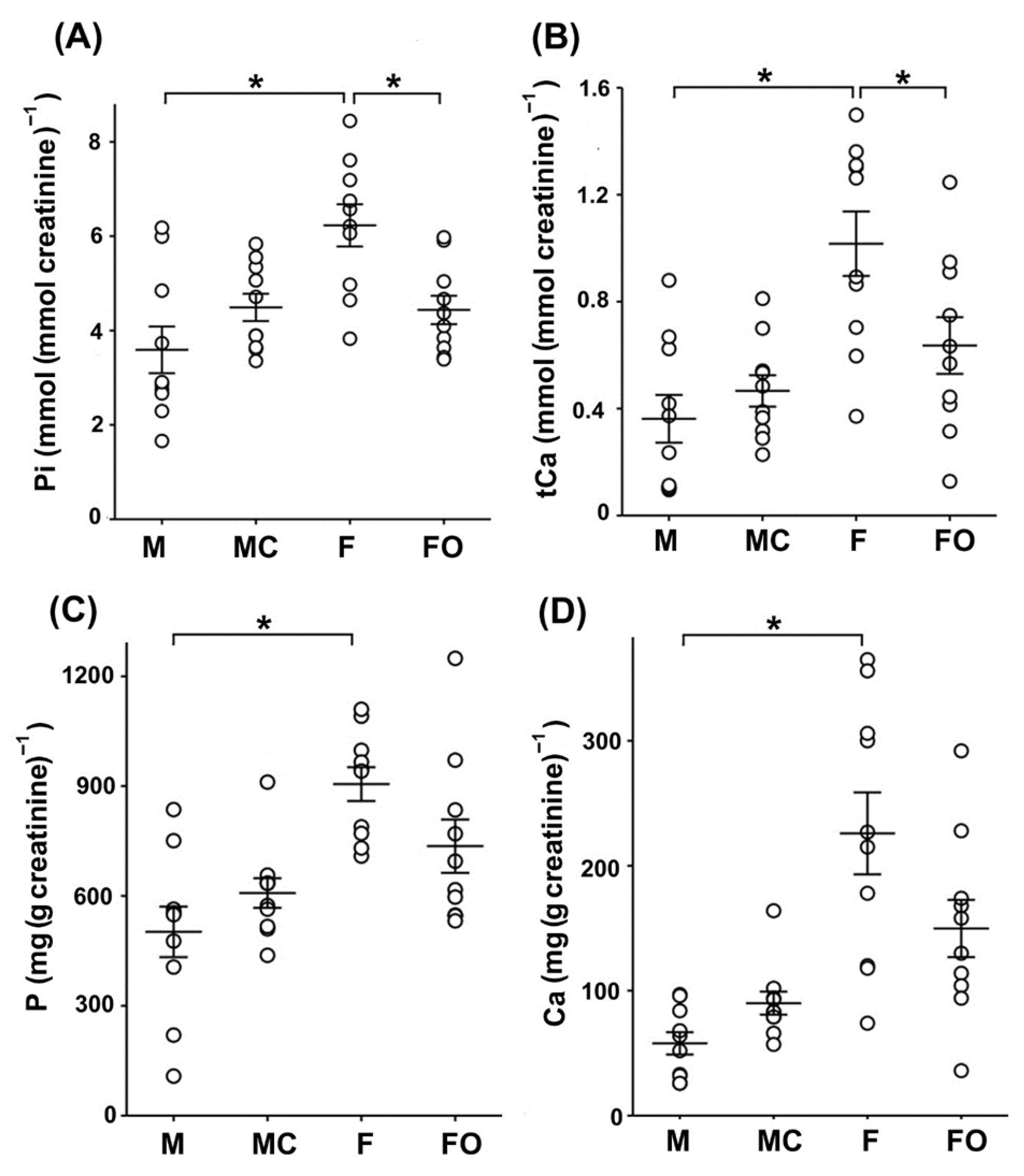 Figure 9. Inorganic phosphate (Pi), total calcium (tCa), phosphorus (P), and calcium (Ca) in rat urine. Urine samples were collected from sham-operated and gonadectomised male and female rats housed in metabolic cages for 24 h. The figure shows data measured in urine samples from 10 animals in each experimental group. Each dot represents a replicate of measured parameters; data are expressed as the mean ± SEM (n = 10). * Statistical significance at p < 0.05 was evaluated by factorial ANOVA followed by Duncan post hoc test. (A,B) Concentrations of Pi and tCa in urine samples were measured biochemically and normalized by urine creatinine concentrations. (C,D) Essential macroelements P and Ca in urine samples were measured by ICP-MS. The total content of P and Ca in urine samples was normalized to urine creatinine concentration. F = sham-operated female; FO = ovariectomized female; M = sham-operated male; MC = castrated male.