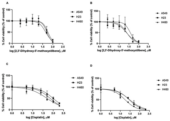Cytotoxicity of 2,3′-dihydroxy-5′-methoxystilbene and cisplatin in NSCLC cell lines. Cell viability was assessed using the MTT assay. (A,B) Viability of A549, H23, and H460 cells treated with 2,3′-dihydroxy-5′-methoxystilbene for (A) 24 h. and (B) 48 h. (C,D) Comparative cytotoxicity of the positive control, cisplatin, following treatment for (C) 24 h and (D) 48 h. Data are presented as mean ± SEM (n = 3 independent experiments).