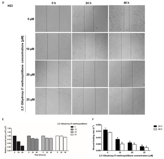Cell migration was assessed using a wound healing assay, as previously described, with minor modifications [18,48]. This assay was performed to evaluate the inhibitory effects of 2,3′-dihydroxy-5′-methoxystilbene on the migratory capacity of NSCLC cell lines H23, H460, and A549. Cells were seeded in 24-well plates at a density of 2 × 105 cells per well and cultured overnight in complete medium until confluence was achieved. A standardized linear scratch was created across the cell monolayer using a sterile 200 μL pipette tip to simulate a wound. Detached cells and cellular debris were removed by gentle washing with phosphate-buffered saline (PBS) (500 μL per well). Subsequently, the cells were treated with various concentrations of 2,3′-dihydroxy-5′-methoxystilbene (0–40 μM) and incubated under standard culture conditions. Wound closure was monitored and documented using phase-contrast microscopy with a Nikon Ts2 inverted microscope (Nikon, Tokyo, Japan). Digital images were captured at 0, 24, and 48 h after scratch induction. The wound area was quantified using ImageJ software version 8 (National Institutes of Health, Bethesda, MD, USA), and the percentage of wound closure was calculated. The migration rate was determined from the slope of the linear regression analysis of wound closure over a 48 h. observation period. All experiments were performed in triplicate to ensure reproducibility.