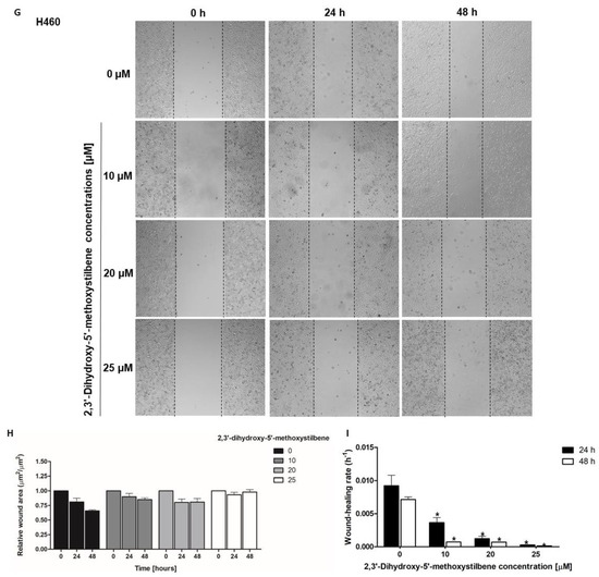 Effect of 2,3′-dihydroxy-5′-methoxystilbene on NSCLC cell migration assessed by wound healing assays. (A,D,G) Representative images of wound closure in A549 (A), H23 (D), and H460 (G) cells treated with increasing concentrations of stilbene (0, 10, 20, 25 μM) for up to 48 h. (B,E,H) Histograms show the relative wound area over time, presented as the mean ± SEM (n = 3). (C,F,I) Wound healing rates (h − 1) at 24 and 48 h. for each treatment concentration. Statistical significance was determined by t-test vs. control (* p < 0.05).