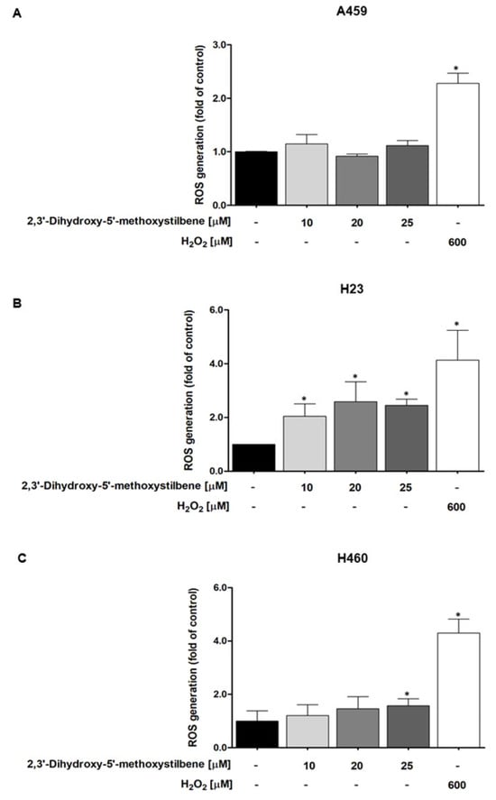 Induction of oxidative stress by 2,3′-dihydroxy-5′-methoxystilbene in NSCLC cell lines with differential antioxidant capacity. Reactive oxygen species (ROS) generation was measured using the DCFH-DA fluorescence assay in (A) A549, (B) H23, and (C) H460 cells treated with increasing concentrations (10, 20, and 25 μM) of 2,3′-dihydroxy-5′-methoxystilbene for 1 h. Hydrogen peroxide (H2O2, 600 μM) was used as a positive control. Data are expressed as fold change relative to the untreated control and are presented as the mean ± SEM (n = 3). Statistical significance was determined using a t-test (* p < 0.05).