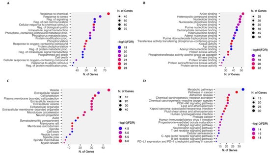 Gene Ontology (GO) and KEGG pathway enrichment analysis of 2,3′-dihydroxy-5′-methoxystilbene-targeted genes. (A) Biological Process (BP): Top enriched GO terms related to cell death, chemical response, the regulation of signaling, and apoptosis. (B) Molecular Function (MF): Enrichment in catalytic activity, ATP binding, protein kinase activity, and nucleotide binding. (C) Cellular Component (CC): Targeted proteins are predominantly associated with intracellular anatomical structures, membranes, and cytoplasmic components. (D) KEGG Pathway Analysis: Major enriched pathways include cancer-related signaling pathways, such as PI3K/Akt, pathways in cancer, chemical carcinogenesis receptor activation, and chemical carcinogenesis reactive oxygen species signaling. Gene counts reflect the number of target genes associated with each GO term or KEGG pathway. Data were analyzed using enrichment tools with a significance threshold of p < 0.05.
