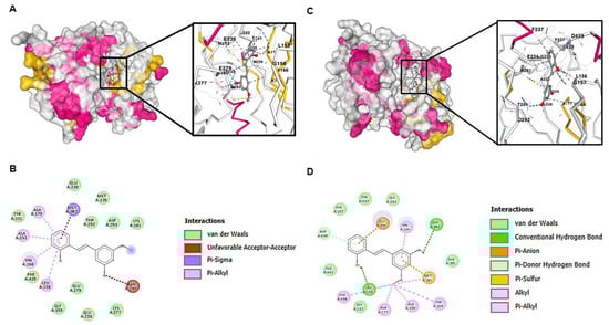 Molecular docking analysis of 2,3′-dihydroxy-5′-methoxystilbene with activated and non-activated AKT conformations. (A) Surface representation of activated AKT showing 2,3′-dihydroxy-5′-methoxystilbene binding within the ATP-binding domain. The zoomed-in view displays the compound positioned in the C1 pocket with detailed molecular contacts. (B) Two-dimensional interaction diagram of 2,3′-dihydroxy-5′-methoxystilbene with activated AKT. (C) Surface representation of non-activated AKT demonstrating compound binding within the ATP-binding region with altered binding pocket geometry compared to the activated form. (D) Two-dimensional interaction map of 2,3′-dihydroxy-5′-methoxystilbene with non-activated AKT. Binding energies (Vina scores): −7.8 kcal/mol for non-activated Akt (3MVH, pocket C1) and −7.7 kcal/mol for activated Akt (1O6L, pocket C1).
