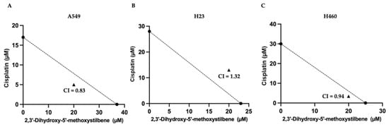 Isobologram graphs of the combined effects of 2,3′-dihydroxy-5′-methoxystilbene and cisplatin on A549 (A), H23 (B), and H460 (C) cells after 48 h. co-treatment. Combination index (CI) values indicate synergism in A549 (CI = 0.83), antagonism in H23 (CI = 1.32), and mild synergism in H460 (CI = 0.94). The CI values suggested the following: antagonism when CI > 1, additive interaction when CI = 1, and synergism when CI < 0.1. Data represent three independent experiments.