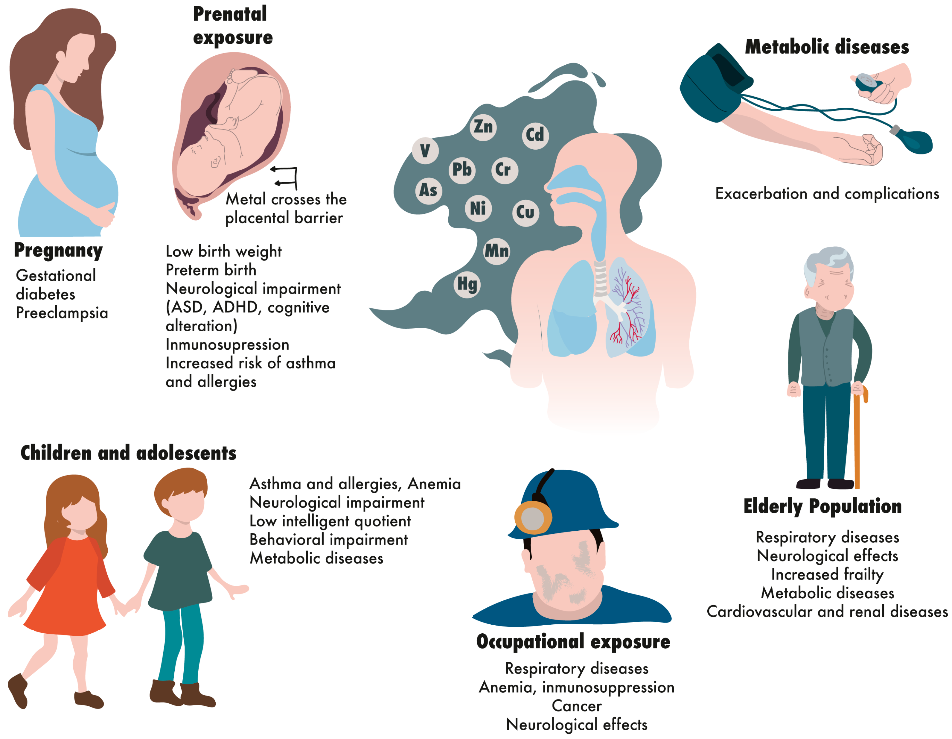 | Vulnerability due to pregnancy | Cd, Pb Mn As | Insulin resistance Gestational diabetes Epigenetic changes that increase the risk of metabolic diseases | [28,88,109,110,111,167,168,169] |