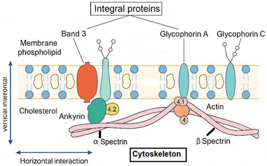 - Lux, S.E. Anatomy of the red cell membrane skeleton: Unanswered questions. Blood 2016, 127, 187–199. [Google Scholar] [CrossRef]