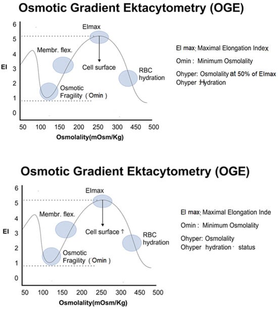 OGE, performed with the Laser-Assisted Optical Rotational Cell Analyzer (LoRRcaR) and osmoscan module, has emerged as the reference method for functional evaluation of RBC membrane mechanics [13,26,27,28,29]. In this assay, RBCs are exposed to a continuous osmotic gradient while subjected to constant shear stress, and their deformation is quantified through laser diffraction. The resulting “osmoscan” curve plots the Elongation Index (EI) across Osmolarity and provides three essential parameters (Figure 3):
