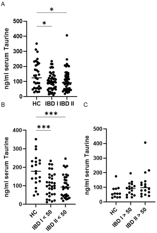 Sustained reduction in serum Taurine levels in inflammatory bowel disease (IBD) patients younger than 50 compared with healthy controls (HC). (A) Serum taurine concentrations were measured in 33 HC and 47 patients with IBD at baseline (I) and after a median follow-up of 45 months (II). Each data point represents an individual participant, and horizontal lines denote the median value for each group. * p < 0.05. IBD patients and HC were divided into two subgroups based on age. Panel (B) includes individuals younger than 50 years, whereas panel (C) shows those aged 50 years or older. Each data point represents the serum taurine concentration of an individual participant, and horizontal bars indicate the median for each group. *** p < 0.001.