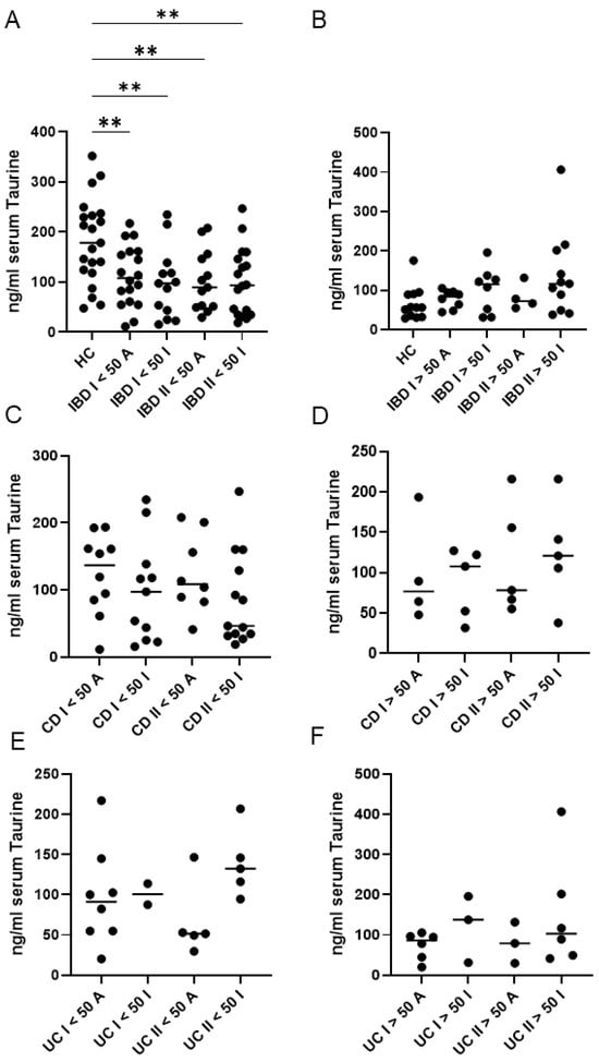 Serum taurine levels in healthy controls (HC), and both ulcerative patients (UC) and Crohn’s disease (CD) patients, according to their age (younger or older than 50 years) and disease activity. (A,B) Taurine was measured in serum samples of 33 HC and 47 IBD patients at baseline (I) and after a median follow-up period of 45 months (II). HC and IBD patients were stratified into subgroups based on their age (younger or older than 50 years) and disease activity [active (A) or inactive (I)]. ** p < 0.01. (C,D) Taurine was measured in serum samples of 29 CD patients at baseline (I) and after a median follow-up period of 45 months (II). CD patients were stratified into subgroups based on their age (younger or older than 50 years) and disease activity [active (A) or inactive (I)]. (E,F) Taurine was measured in serum samples of 18 UC patients at baseline (I) and after a median follow-up period of 45 months (II). UC patients were stratified into subgroups based on their age (younger or older than 50 years) and disease activity [active (A) or inactive (I)]. Each data point in the graph represents the serum taurine concentration of an individual participant, and the horizontal bars indicate the median value for each subgroup.