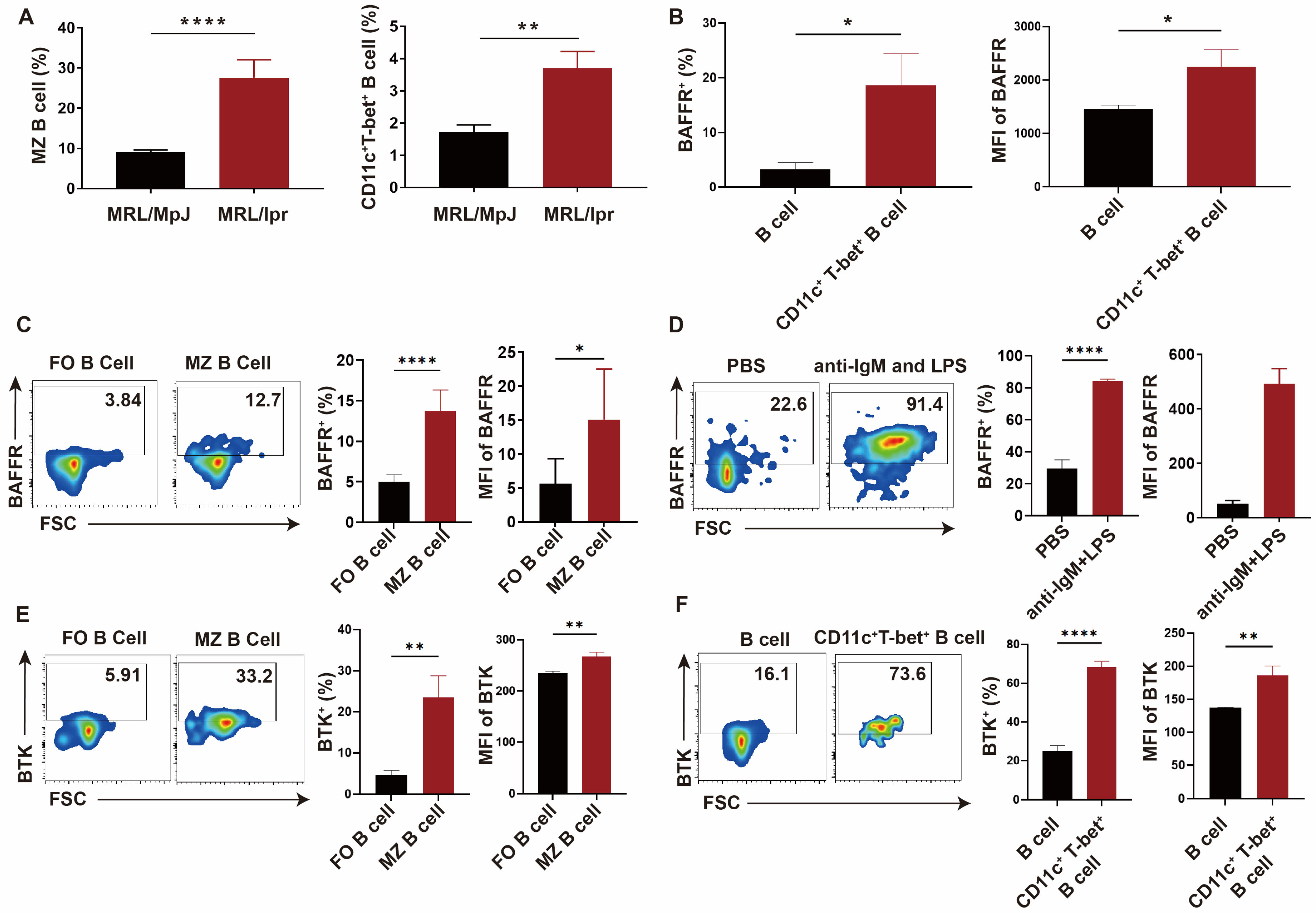 2.1. The Expression of BAFFR and BTK Was Higher in MZ B Cells and CD11c+T-bet+ Autoreactive B Cells from MRL/lpr Mice