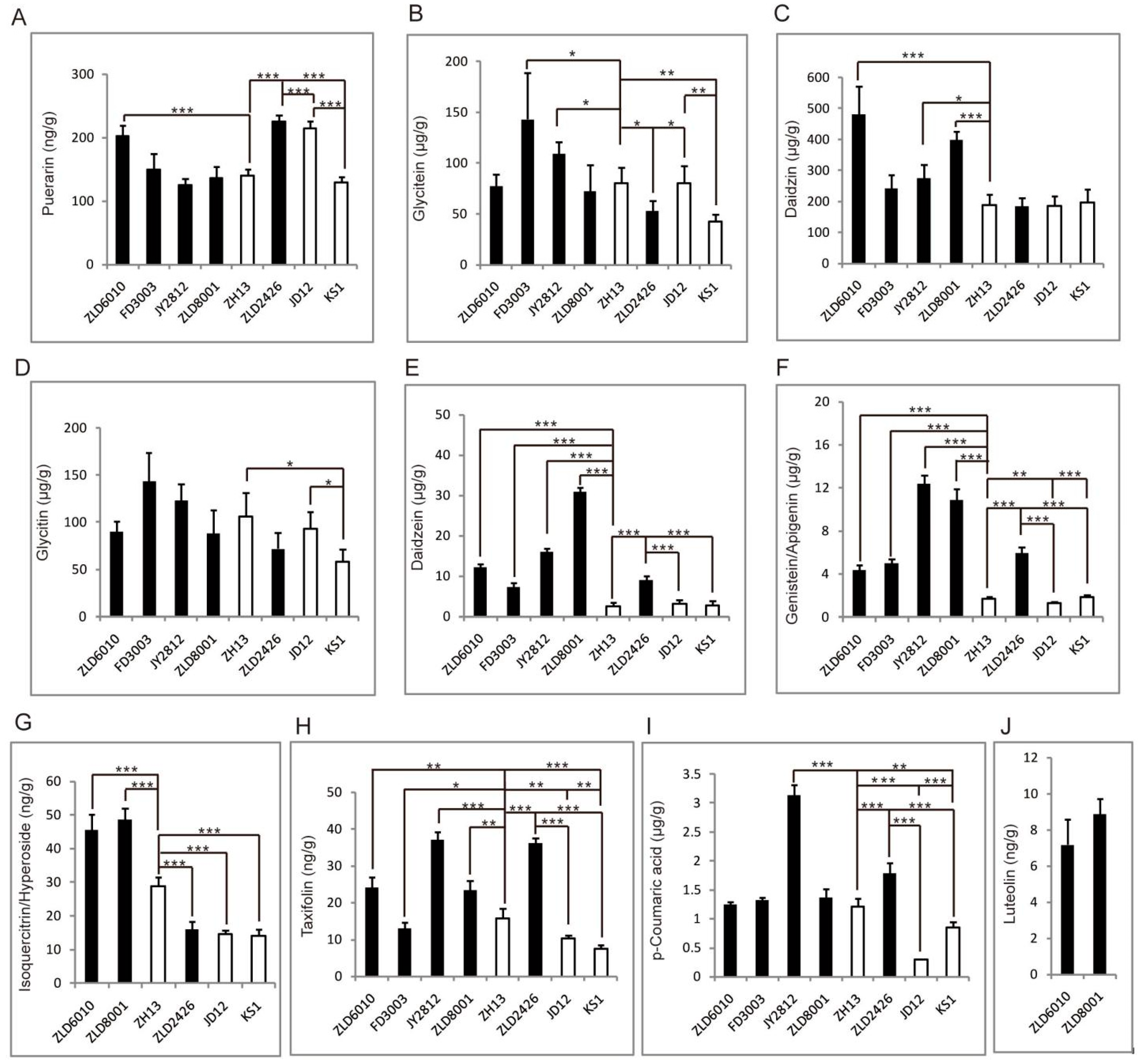 | Soybean Varieties | Flavonoids Content (μg/g) | Significant Difference (Compared to) | ||