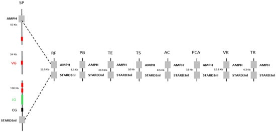 Decorrelation between the presence of T γδ cells and the conservation of butyrophilins in squamates. Observation of the deletion of T γδ cells through a comparative genomic analysis of the distance between the AMPH and STARD3NL genes, which flank the γ chain in Sphenodon punctatus (SP), the closest living relative of squamates. VG, JG, and CG correspond, respectively, to the Vγ chain, Jγ chain, and Cγ chain. The squamates included in this analysis are: Rhineura floridana (RF), Python bivittatus (PB), Thamnophis elegans (TE), Tiliqua scincoides (TS), Anolis carolinensis (AC), Pituophis catenifer annectens (PCA), Varanus komodoensis (VK), and Tiliqua rugosa (TR).
