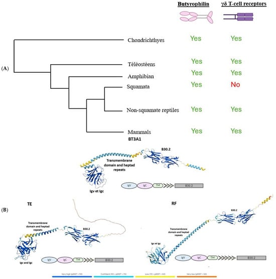 γδ T cells are known to be expressed exclusively in jawed vertebrates. Butyrophilins, meanwhile, have only been described as interacting with these cells in humans, mice, and alpacas [10], while their characteristics remain largely unexplored in other jawed vertebrates. After demonstrating the widespread absence of γδ T lymphocytes across all squamates, we sought to investigate the conservation of butyrophilins in jawed vertebrates in order to assess the potential co-evolution between butyrophilins and the γδ TCR. To this end, we used the human butyrophilin BTN3A1 sequence, known for its role in phosphoantigen recognition and subsequent activation of γδ T lymphocytes [11,12,13], as a query to identify butyrophilins across a range of species, employing BLASTp or tBLASTn for incomplete genome assemblies (see Section 4). These analyses revealed the presence of butyrophilins in all species tested, including squamates, despite their lack of γδ TCRs (Figure 2A). In light of these results, we wondered about the functionality of the butyrophilins identified in squamates and whether these might instead be artifacts or ancestral pseudogenes retained following the loss of γδ T lymphocytes. To investigate this, we used the AlphaFold prediction tool (version DB v6, accessed on 21 May 2025) to model the structures of butyrophilins from two squamates, Thamnophis elegans (TE) and Rhineura floridana (RF), and compared them to the human butyrophilin BT3A1. Structurally, the squamate butyrophilins exhibited a high degree of similarity to human BT3A1, including readily identifiable IgV, IgC, and B30.2 domains, a transmembrane domain, and a variable number of heptad repeats (Figure 2B). The only notable difference was in the number of heptad motifs downstream of the transmembrane domain (Figure 2B). These motifs, primarily structural, are frequently involved in the stabilization of coiled-coil helices [14]. Since the IgV, IgC, and B30.2 domains are conserved, this structural difference is unlikely to affect the functional role of the butyrophilins. Predicted structures for butyrophilins from other squamates mentioned in this article are presented in Figure S1. The finding that butyrophilins are conserved across all jawed vertebrates, combined with the fact that γδ T lymphocytes occur exclusively in this group, suggests that butyrophilins and γδ T lymphocytes emerged simultaneously in the common ancestor of jawed vertebrates, highlighting the critical role of butyrophilins for these lymphocytes. The construction of a phylogeny of butyrophilins across selected organisms further clarified the relationships between these molecules, revealing that butyrophilins are class-specific and have undergone numerous lineage-specific duplication events (Figure S2).