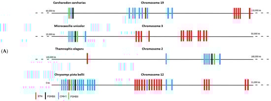 The retrieved protein sequences were mapped onto the genomes of the species of interest using the tBLASTn tool (version BLAST+ 2.16.0, accessed on 2 April 2025). Default parameters of the tool were used for all analyses.