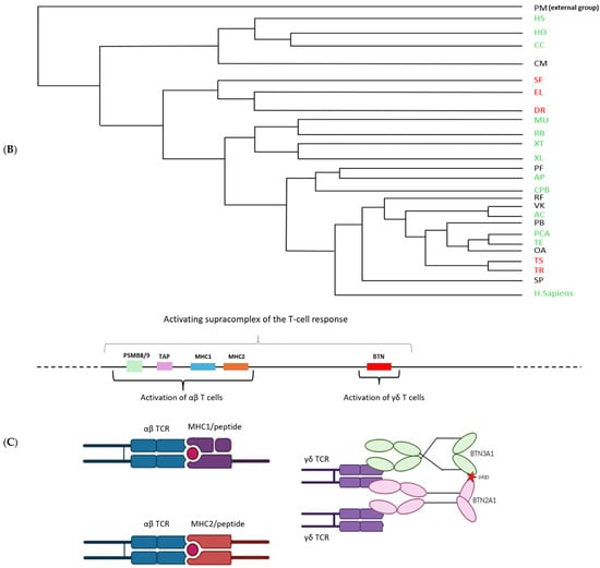 Chromosomal mapping of the genes encoding butyrophilins and hypothesis of a T-cell activating supracomplex. (A), Localization of the genes encoding butyrophilins and class I MHC molecules on the genome of various jawed vertebrates. The genes encoding PSMB8 and PSMB9 were also mapped to confirm the correct positioning of the class I MHC genes. (B), Phylogenetic tree illustrating the relationships among butyrophilins in jawed vertebrates. Organisms indicated in green possess genes encoding butyrophilins located near class I MHC genes. Those in red represent these genes on separate chromosomes. Organisms in black correspond to cases for which chromosomal localization data are not available. Abbreviations of the Latin names and the classification of the different phyla are presented in Section 4. (C), Reconstruction of the ancestral activating supracomplex involved in the activation of αβ and γδ T cells.