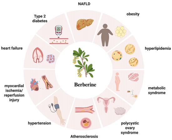 BBR demonstrates therapeutic effects on cardiometabolic conditions, including metabolic diseases such as type 2 diabetes, obesity, non-alcoholic fatty liver disease, hyperlipidemia, metabolic syndrome, and polycystic ovary syndrome (PCOS), as well as cardiovascular diseases like atherosclerosis, hypertension, myocardial ischemia/reperfusion injury, and heart failure. Created in BioRender. Tian, X. (2025) https://BioRender.com/ud9id3s, accessed on 12 December 2025.