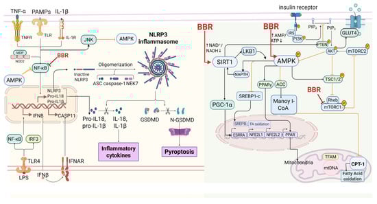 BBR targets core hubs such as AMPK, SIRT1, and NF-κB. By activating AMPK, it enhances insulin sensitivity and GLUT4 translocation, thereby lowering blood glucose levels. Simultaneously, BBR activates SIRT1, with AMPK and SIRT1 mutually reinforcing each other. Through transcriptional regulation, including deacetylation and mitochondrial programming, BBR further amplifies its regulatory effects and modulates the PI3K/AKT/mTOR pathway. Inhibiting NF-κB not only activates AMPK but also inhibits NLRP3, exerting anti-inflammatory effects. In this figure, “↑” denotes activation, “↓” denotes reduction and “⊣” denotes inhibition. Created in BioRender. Tian, X. (2025) https://BioRender.com/7hnaic1, accessed on 12 December 2025.