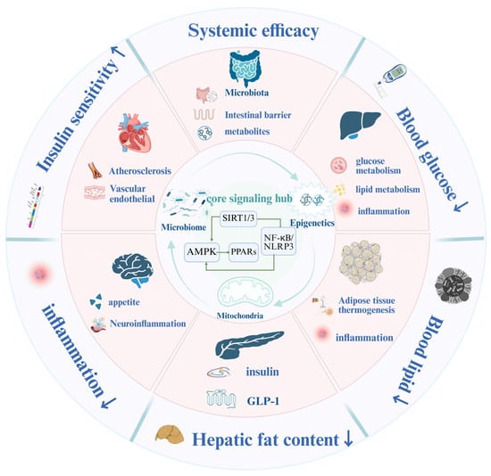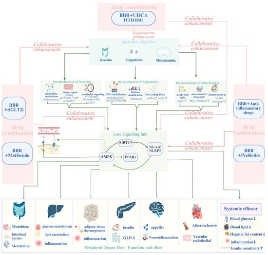 The combination of BBR with the five drugs shown in the figure can synergistically enhance upstream regulatory sources, including gut microbiota (increasing the species abundance of gut microbiota, repairing the gut barrier, increasing the production of metabolites, etc.) and epigenetics (DNA methylation, histone modification, regulation of non-coding RNAs, etc.). Meanwhile, it can also synergistically regulate signaling pathways, such as the SIRT1 and NLRP3 signaling pathways centered around AMPK-InsR. In this figure, “↑” denotes incrassation, and “↓” denotes reduction. Created in BioRender. Tian, X. (2026) https://BioRender.com/93mnik1, accessed on 3 January 2026.