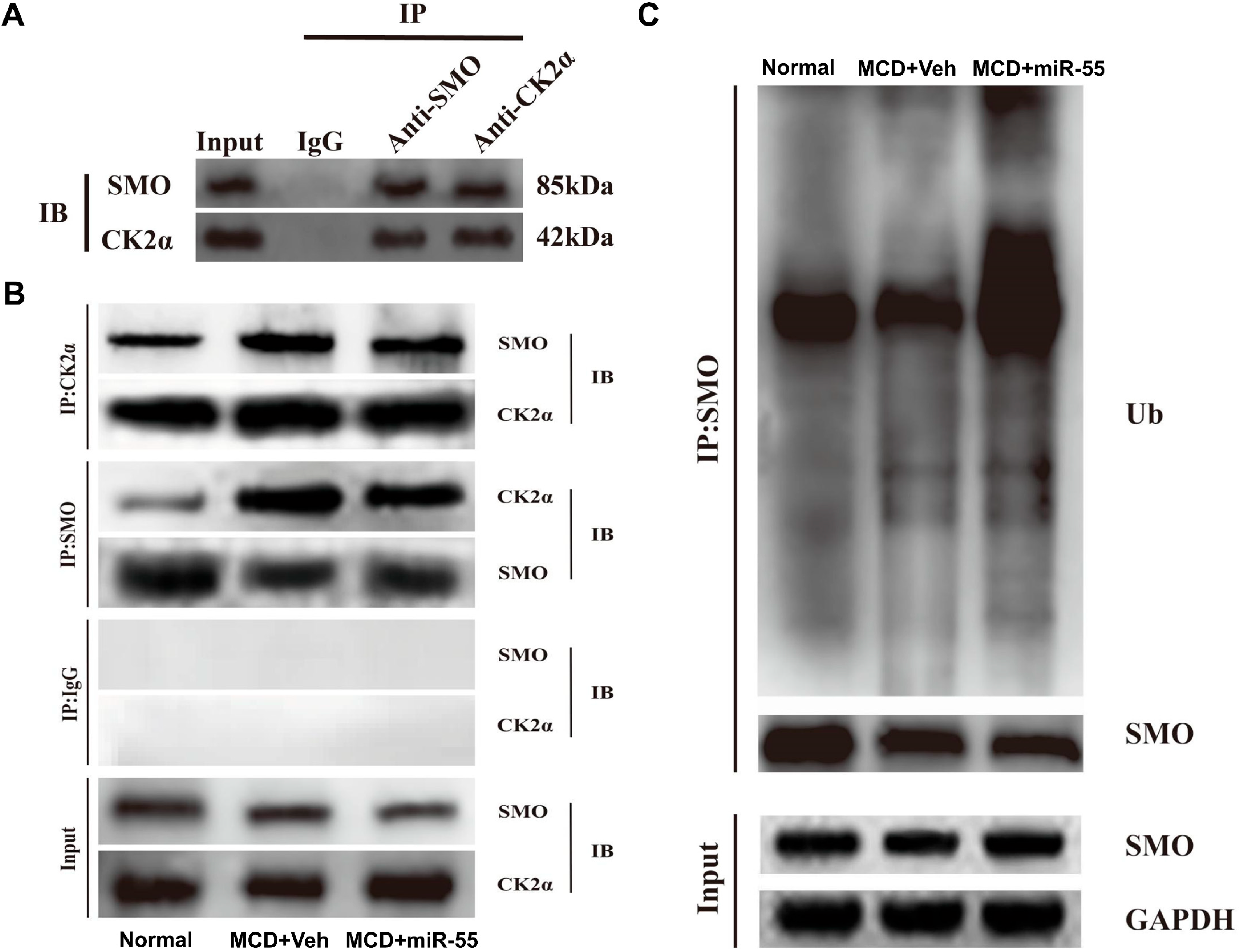 2.5.2. miR-55 Disrupts the CK2α–SMO Complex and Promotes Ubiquitin-Mediated Degradation of SMO