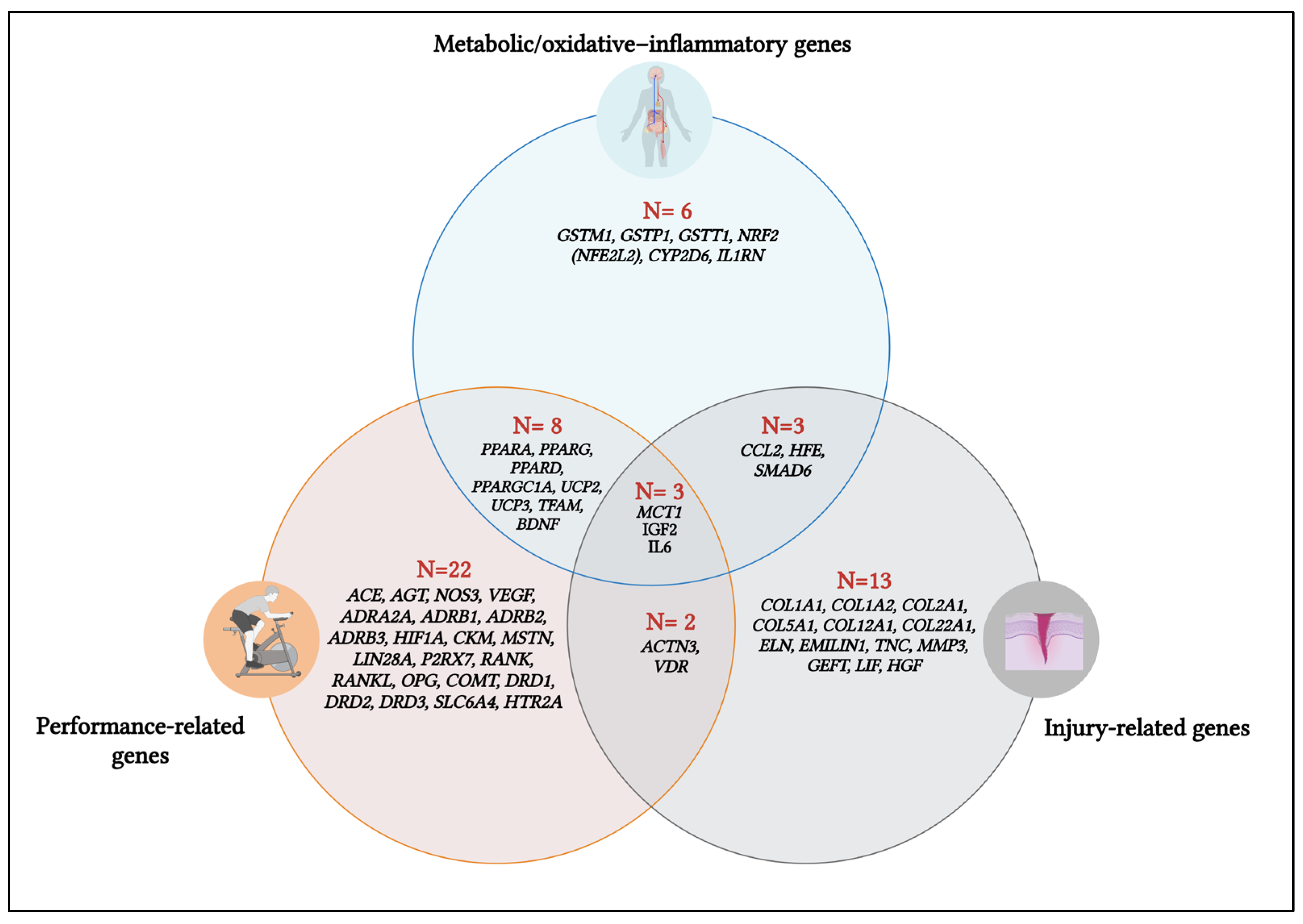 | HGF (SF, F-TCF, HGFB, HPTA) | variants | — | Muscle regeneration | Included in referee injury-genetic panels |
