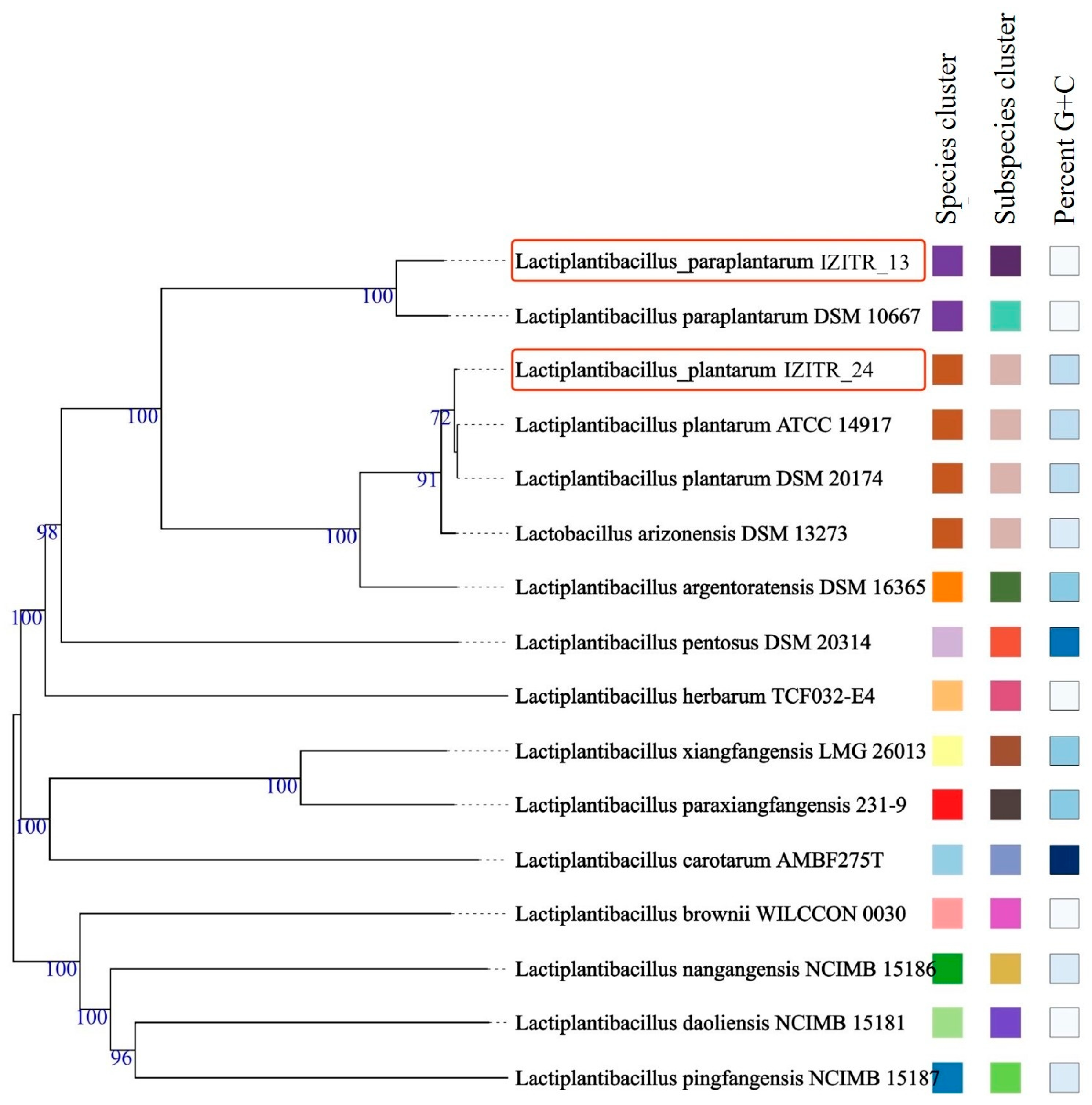 - Benk, R.; Ortakcı, F. Comparative genome analysis of Lactiplantibacillus paraplantarum. Bitlis Eren Univ. J. Sci. 2024, 13, 366–375. [Google Scholar] [CrossRef]