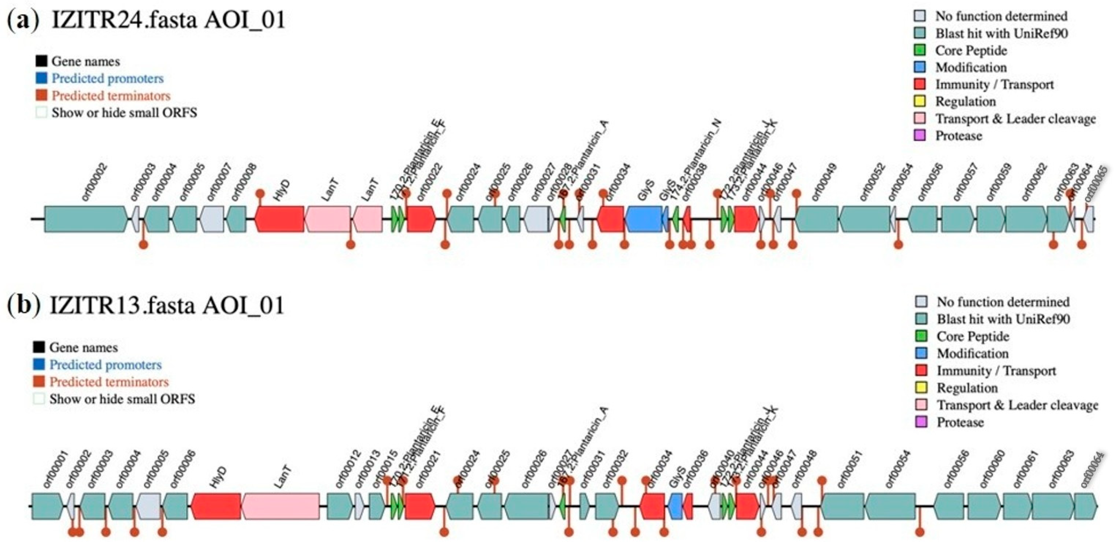 - Goel, A.; Halami, P.M. Structural and biosynthetic diversity of plantaricins from Lactiplantibacillus. Appl. Microbiol. Biotechnol. 2023, 107, 5635–5649. [Google Scholar] [CrossRef] [PubMed]