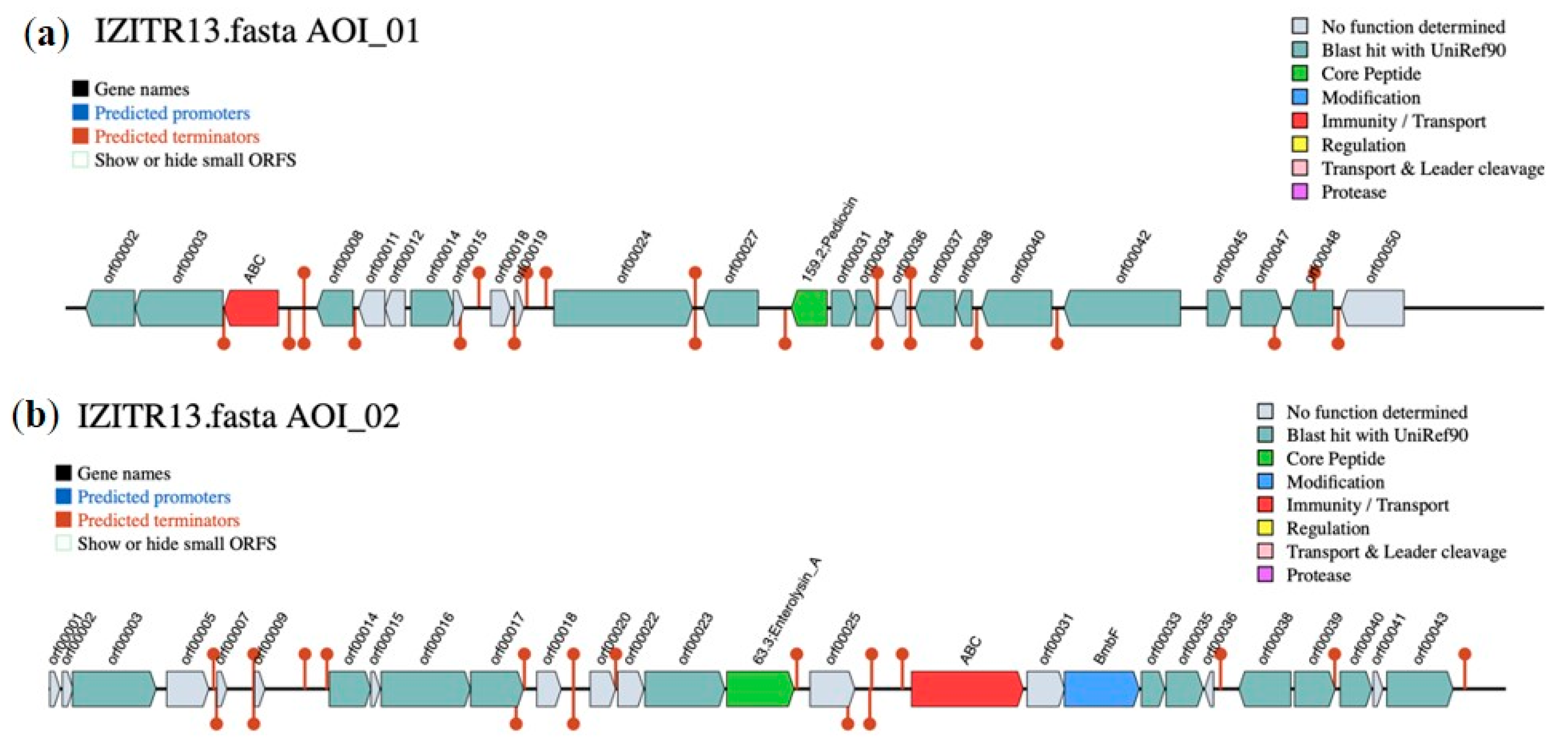 - Tai, H.F.; Foo, H.L.; Rahim, R.A.; Loh, T.C.; Abdullah, M.P.; Yoshinobu, K. Molecular characterisation of new organisation of plnEF and plw loci of bacteriocin genes harbour concomitantly in Lactobacillus plantarum I-UL4. Microb. Cell Fact. 2015, 14, 89. [Google Scholar] [CrossRef]