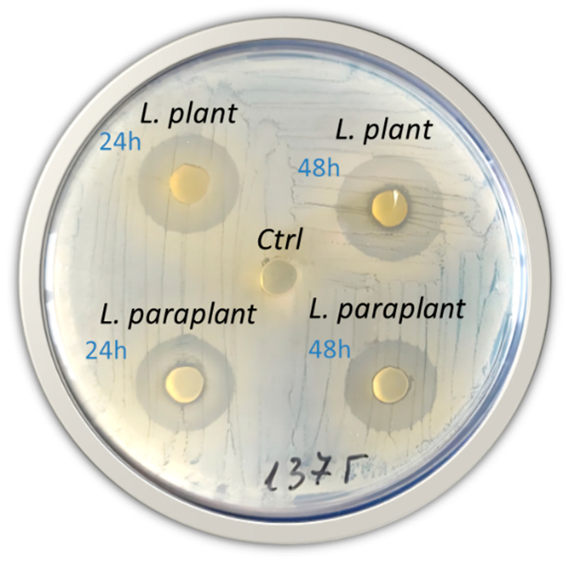 2.3. Antimicrobial Activity of L. plantarum IZITR_24 and L. paraplantarum IZITR_13
