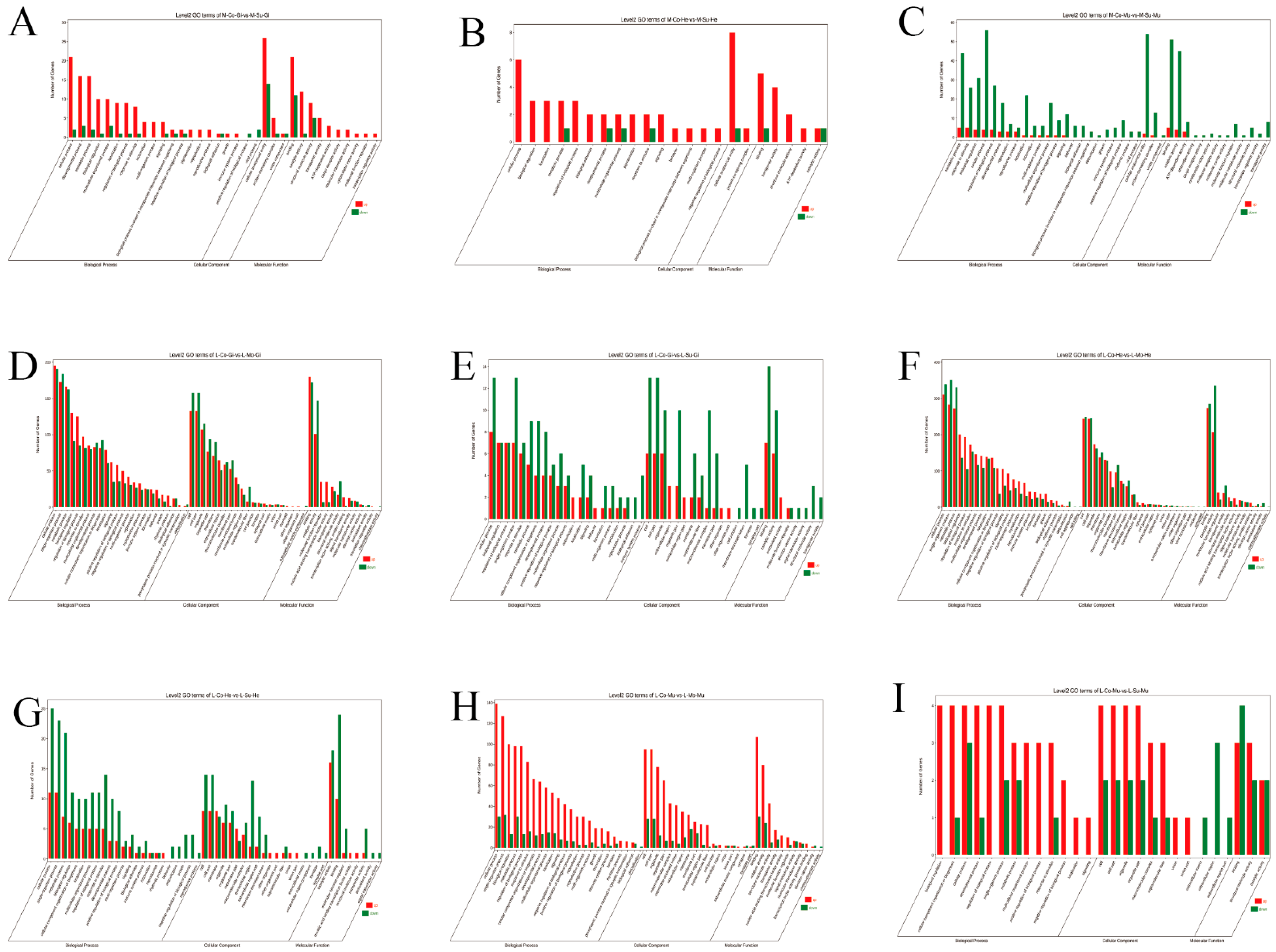 Figure 1 shows the volcano plots of differentially expressed genes from the nine comparison sets: M-Co-Gi vs. M-Su-Gi, M-Co-He vs. M-Su-He, M-Co-Mu vs. M-Su-Mu, L-Co-Gi vs. L-Mo-Gi, L-Co-Gi vs. L-Su-Gi, L-Co-He vs. L-Mo-He, L-Co-He vs. L-Su-He, L-Co-Mu vs. L-Su-Mu, and L-Co-Mu vs. L-Mo-Mu.