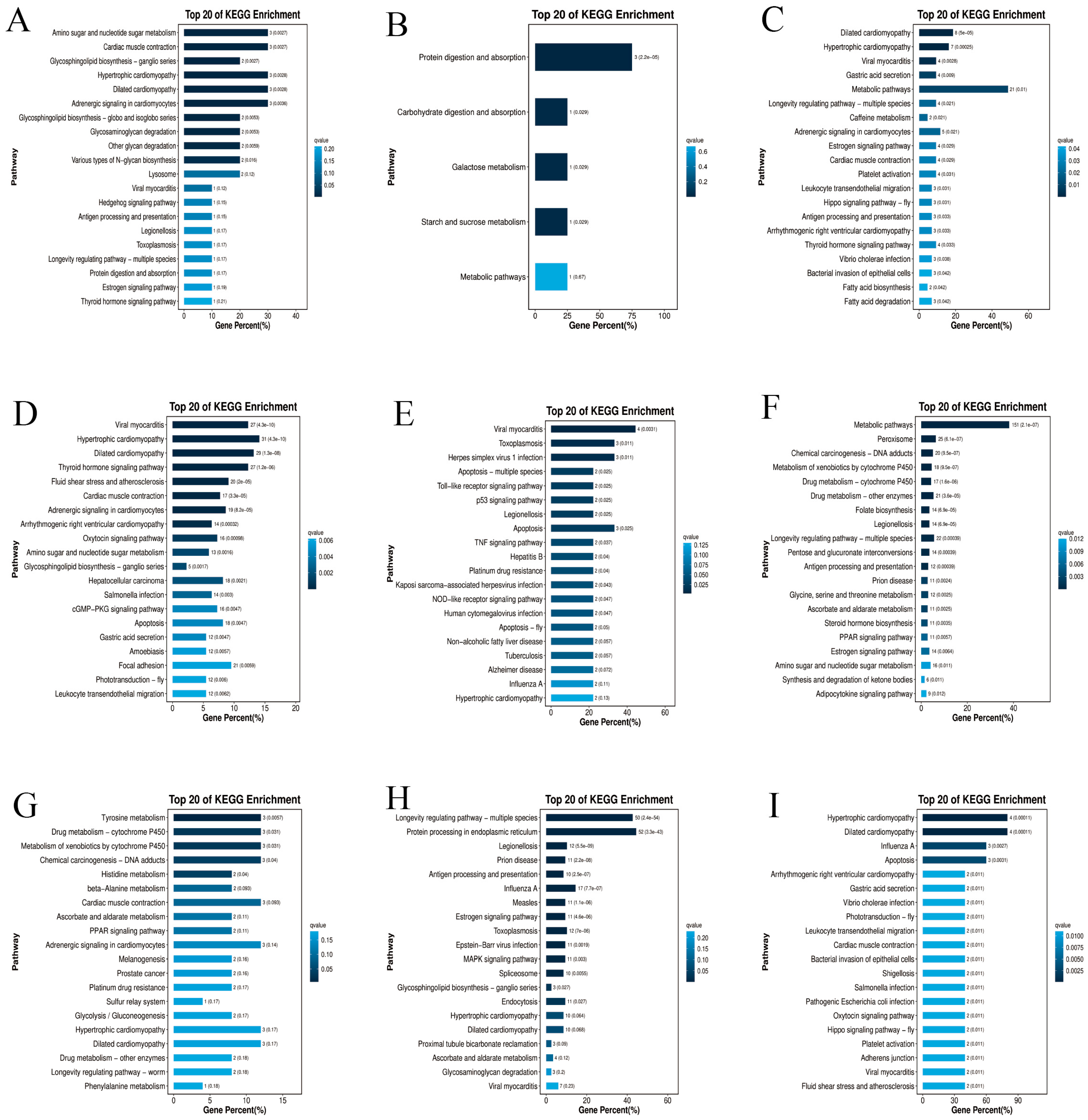 L. vannamei, 824 DEGs (L-Co-Gi vs. L-Mo-Gi) were enriched in 270 pathways; 34 DEGs (L-Co-Gi vs. L-Su-Gi) were mapped to 81 pathways; 1299 DEGs (L-Co-He vs. L-Mo-He) were associated with 288 pathways; 105 DEGs (L-Co-He vs. L-Su-He) were assigned to 57 pathways; 338 DEGs (L-Co-Mu vs. L-Mo-Mu) were enriched in 191 pathways; and 10 DEGs (L-Co-Mu vs. L-Su-Mu) were mapped to 39 pathways. The top 20 most significantly enriched KEGG pathways from all comparison groups are presented in
