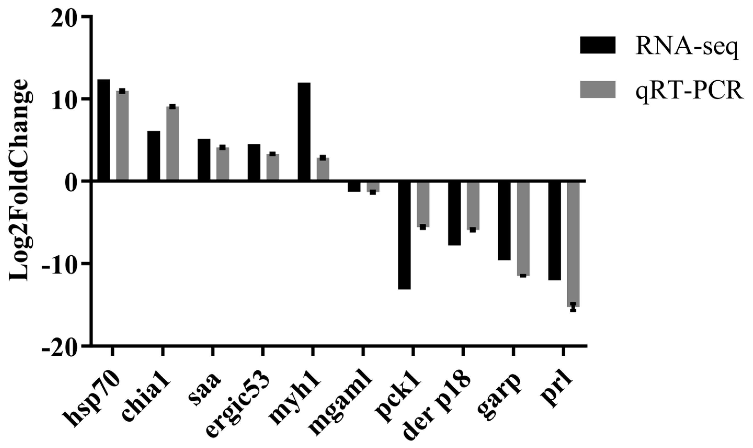 Ten DEGs were randomly selected for experimental validation by quantitative RT-PCR (qRT-PCR). These genes included heat shock protein 70 kDa (