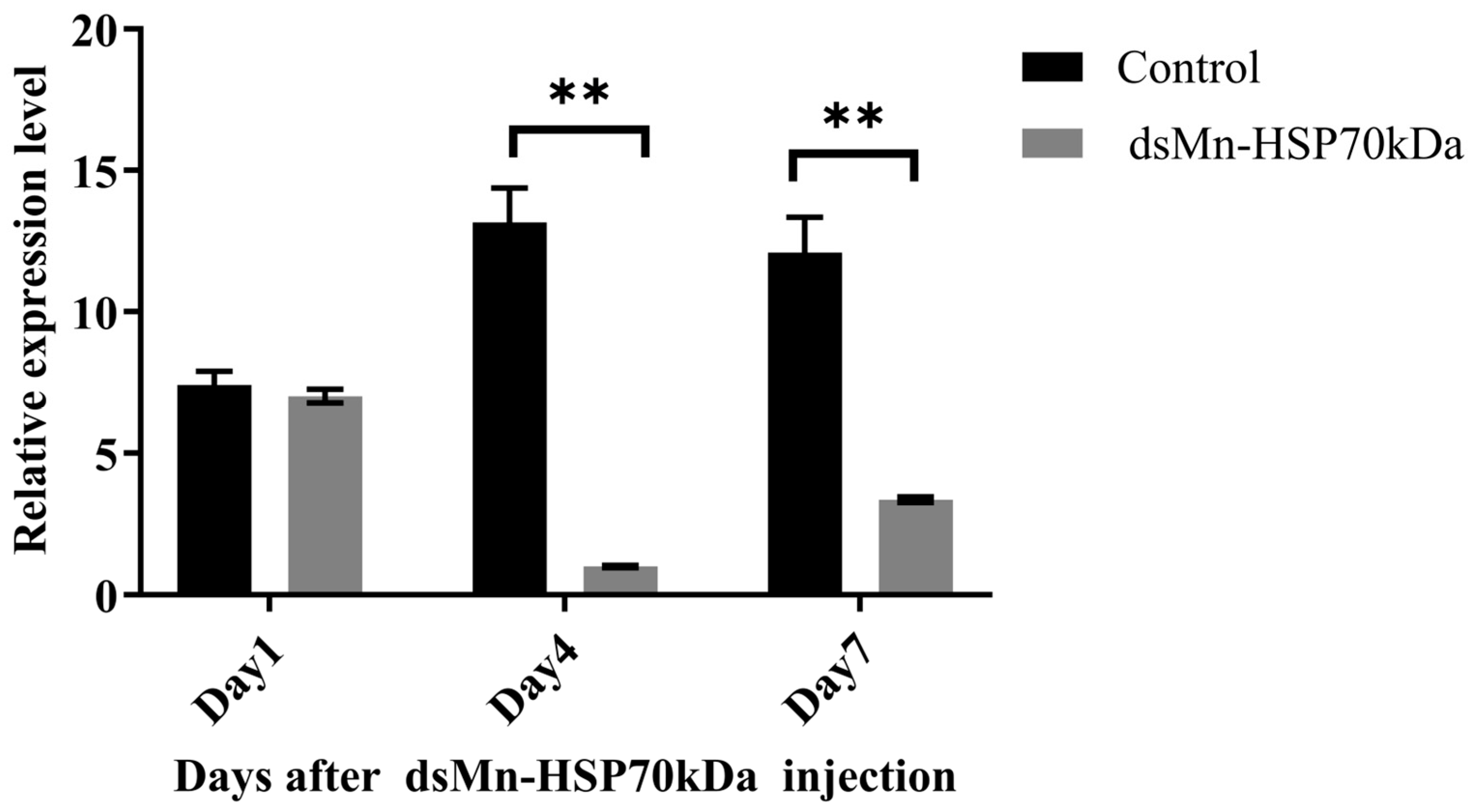 The short-term RNAi efficiency was monitored at 1, 4, and 7 days post-injection. The results demonstrated that dsRNA injection exhibited no significant effect on Mn-HSP70 expression at day 1 post-injection, with no statistically significant difference observed between the experimental and control groups (