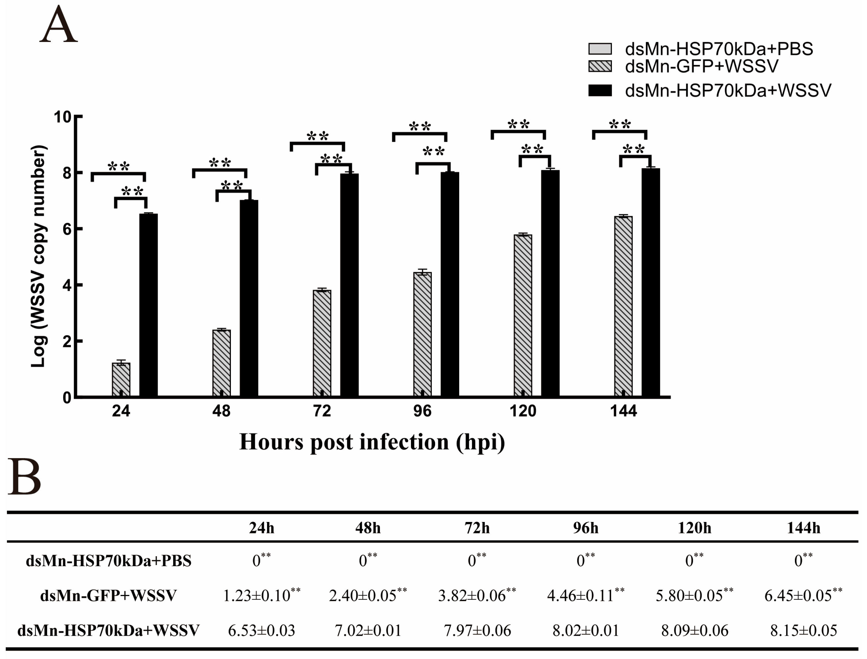 Muscle tissues were collected from three experimental groups—dsMn-HSP70kDa + PBS, dsMn-GFP + WSSV, and dsMn-HSP70kDa + WSSV—at various time points from 0 to 144 h, and WSSV copy numbers were assessed by qRT-PCR. The results showed that no WSSV was detected in any muscle samples from the dsMn-HSP70kDa + PBS control group throughout the 0–144 h period. In contrast, the dsMn-HSP70kDa + WSSV experimental group exhibited significantly higher WSSV copy numbers at 24, 48, 72, 96, 120, and 144 h compared to the dsMn-GFP + WSSV control group. These findings indicate that injection of dsMn-HSP70kDa reduces the resistance of