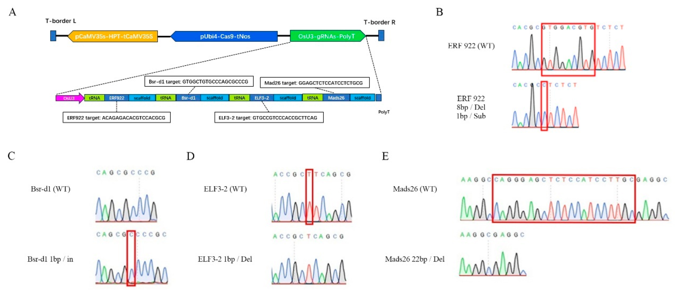 Luo, H.; Zou, H.; Lin, S.; Liu, J.; Zhou, G.; Gao, L.; Huang, J.; Li, J.; Gao, J.; Ma, C. Multiplex Editing of OsMads26, OsBsr-d1, OsELF3-2 and OsERF922 with CRISPR/Cas9 Confers Enhanced Resistance to Pathogens and Abiotic Stresses and Boosts Grain Yield in Rice (Oryza sativa). Int. J. Mol. Sci. 2026, 27, 781. https://doi.org/10.3390/ijms27020781