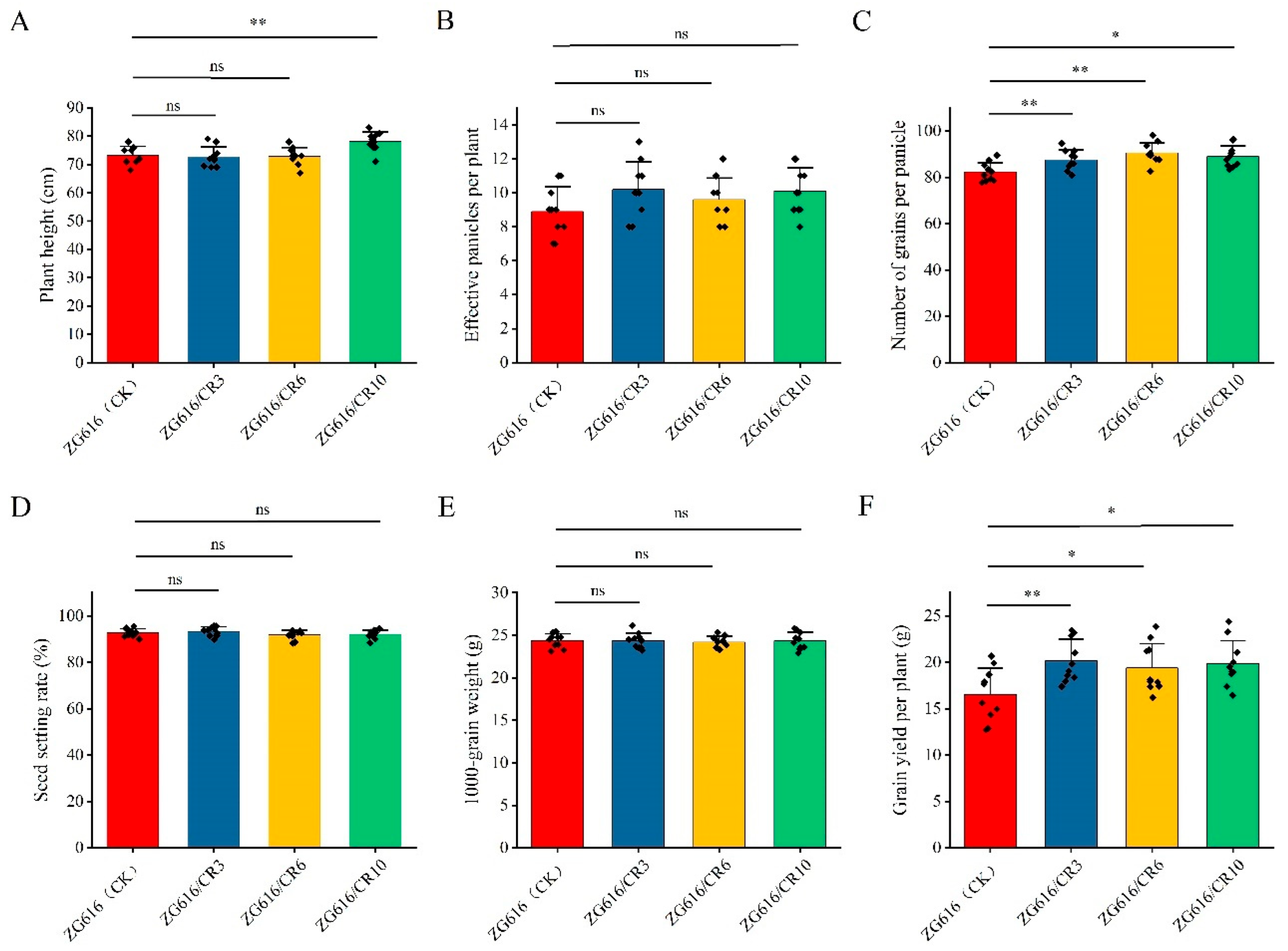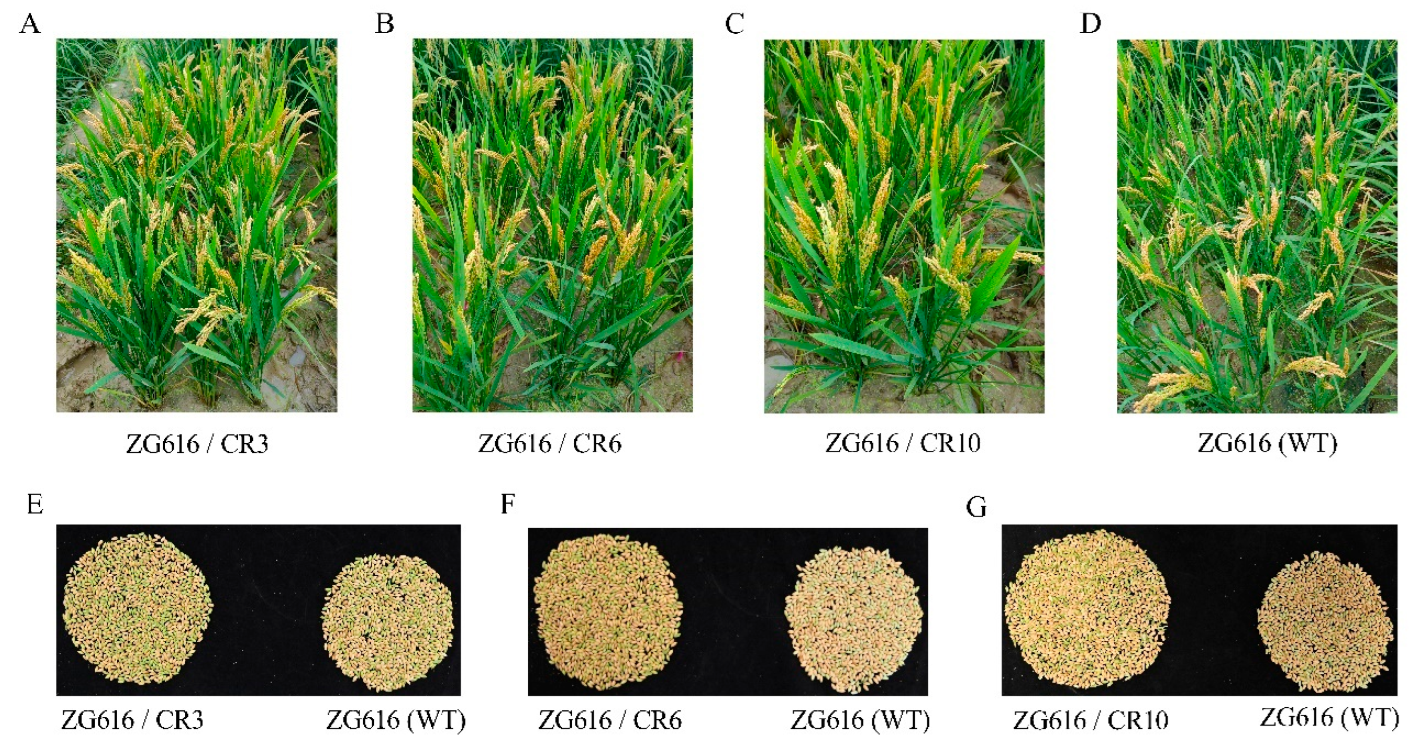 2.4. Knockout of OsMads26, OsBsr-d1, OsELF3-2 and OsERF922 Genes Boosts Grain Yield Potential