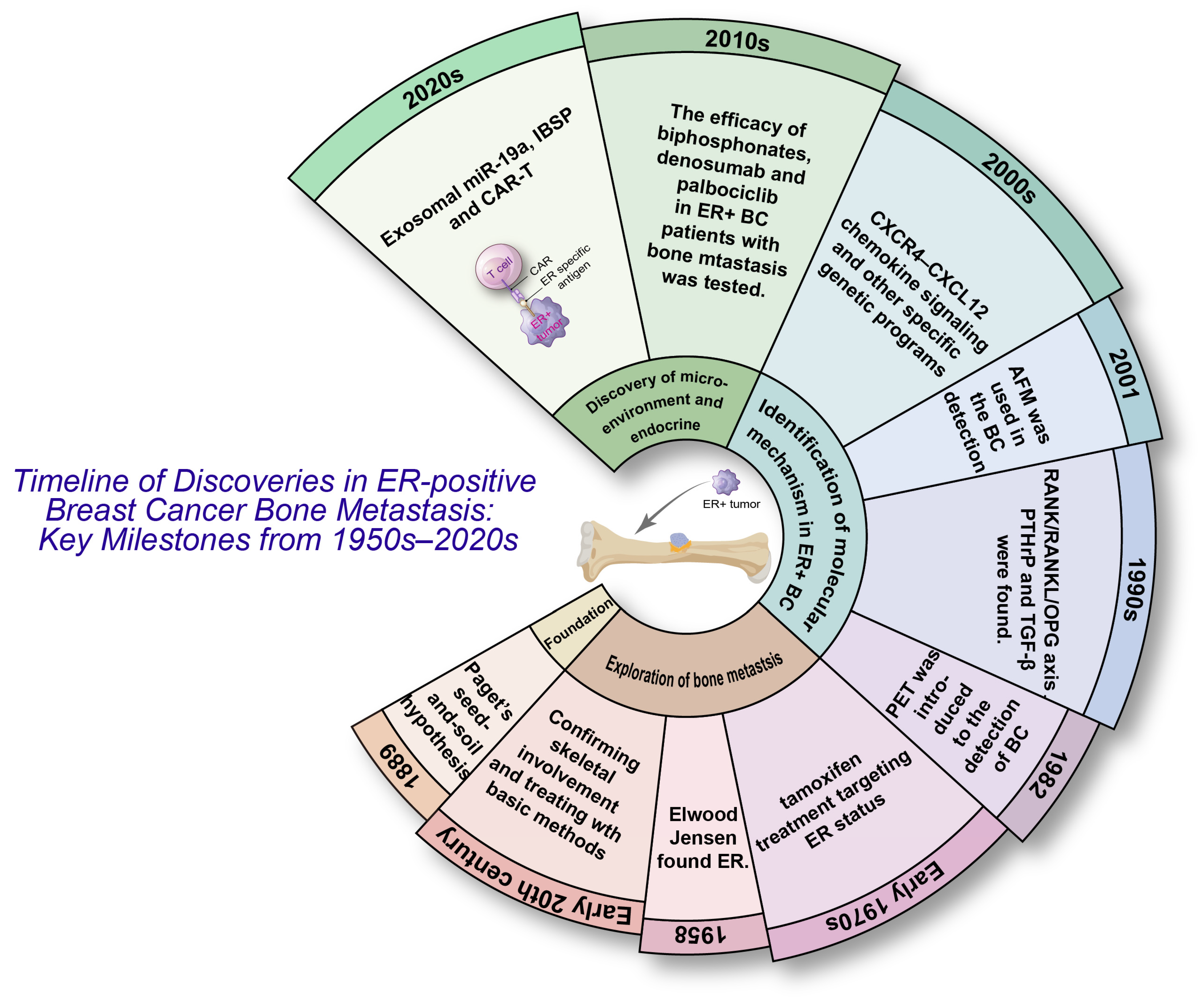 These historical milestones illustrate a progression from observational pathology to precise mechanistic understanding and targeted therapy, establishing ER+ bone metastasis as a biologically distinct entity shaped by hormone signaling, tumor–bone crosstalk, and niche-driven evolution.