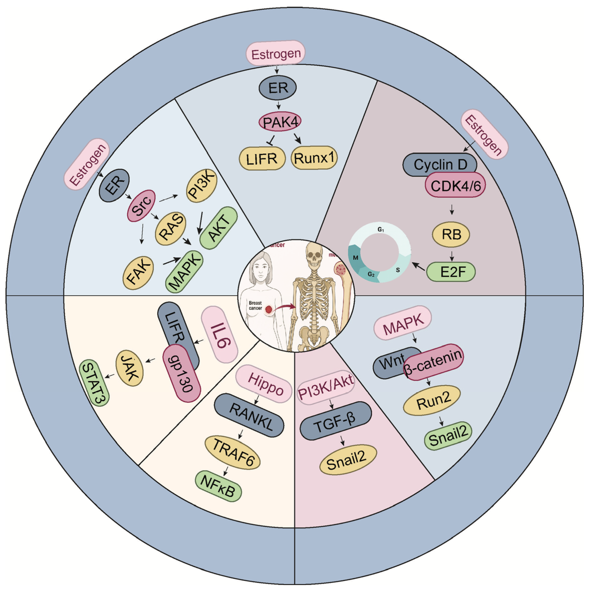 In addition to the genetic alterations that predispose ER+ breast cancer cells to skeletal colonization, growing evidence indicates that these genomic drivers exert their pro-metastatic effects through intricate signaling networks. These pathways regulate critical cellular behaviors, including proliferation, migration, immune evasion, and resistance to apoptosis, while concurrently remodeling the bone microenvironment to support metastatic engraftment and progression. The subsequent section delineates the principal signaling cascades such as transforming growth factor-beta (TGF-β), BMP-SMAD, Hippo, and ERα-Src-p190 RhoGAP that govern the pathophysiology of ER+ breast cancer bone metastasis and elucidates the pivotal regulatory proteins that serve as integrative nodes within these interconnected networks.