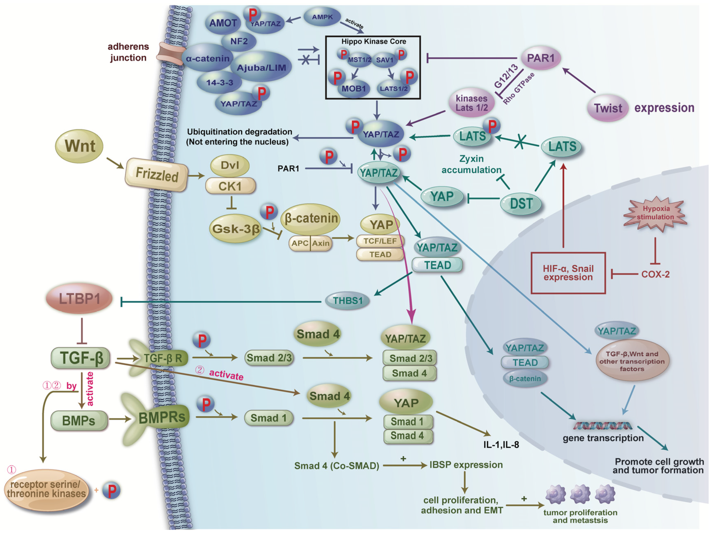 Cooperative signaling pathways orchestrating breast cancer bone metastasis. This schematic highlights the convergence of multiple intracellular networks—including Wnt/β-catenin, TGF-β/Smad, and Hippo/YAP–TAZ pathways—together with additional regulators such as PAR1, Twist, COX-2, HIF-α, and adherens junction proteins. These pathways collectively modulate gene transcription, cell proliferation, epithelial–mesenchymal transition (EMT), and tumor–microenvironment interactions, thereby remodeling bone homeostasis and facilitating metastatic colonization. The figure emphasizes that bone metastasis is not driven by a single axis but arises from the synergistic regulation of diverse signaling modules that integrate proliferative, migratory, and osteotropic programs. Arrows indicate activation or promotion, whereas blunt-ended lines indicate inhibition. “P” denotes phosphorylation. Numbers ①② indicate different signaling routes downstream of TGF-β/BMP receptors.
