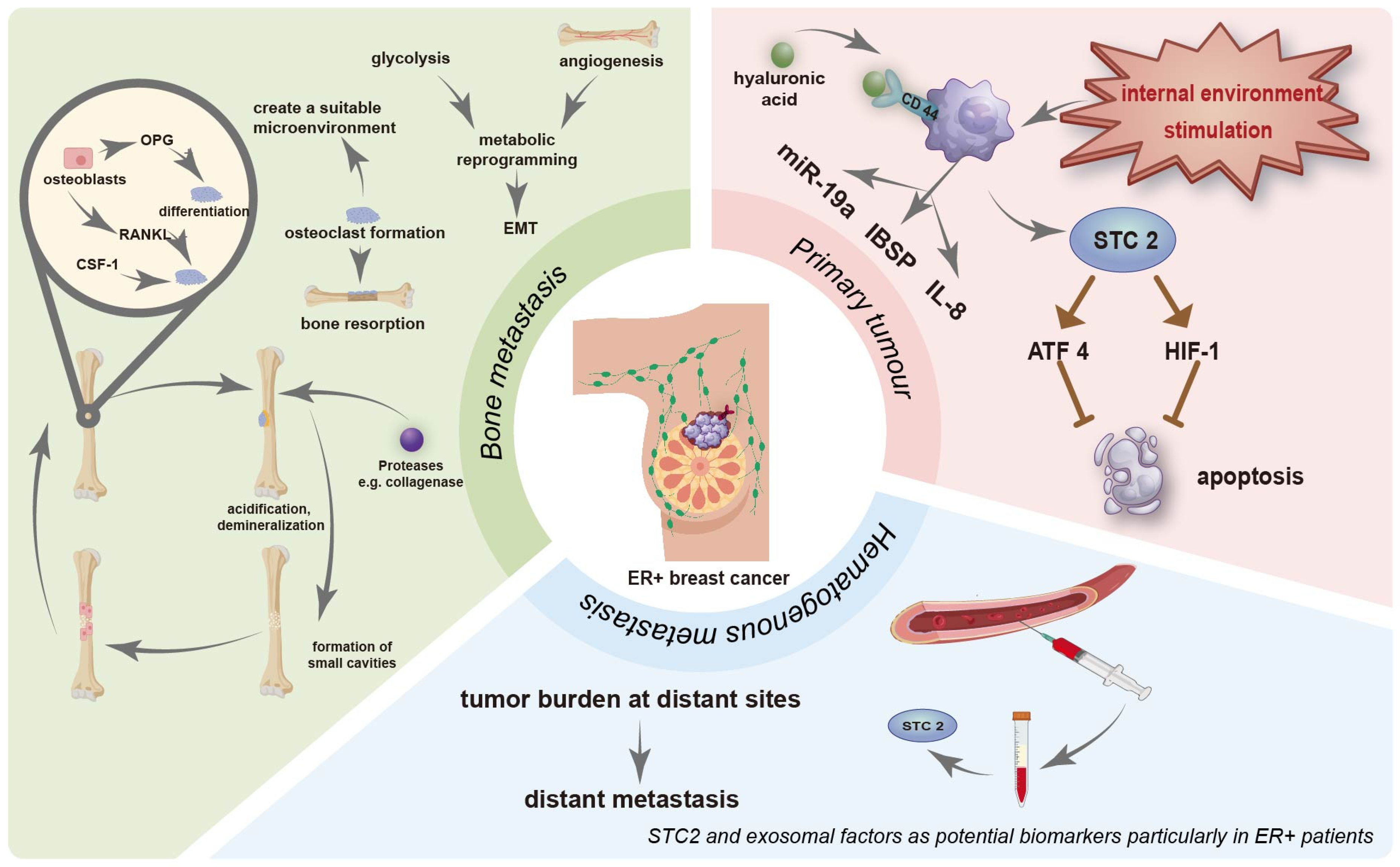 + tumor cells exhibit pronounced long-term dormancy within bone marrow niches, remaining quiescent for years until reactivated by inflammatory or microenvironmental cues. Furthermore, the bone microenvironment promotes endocrine resistance. Exosomal miR-19a and IBSP was identified as key ER