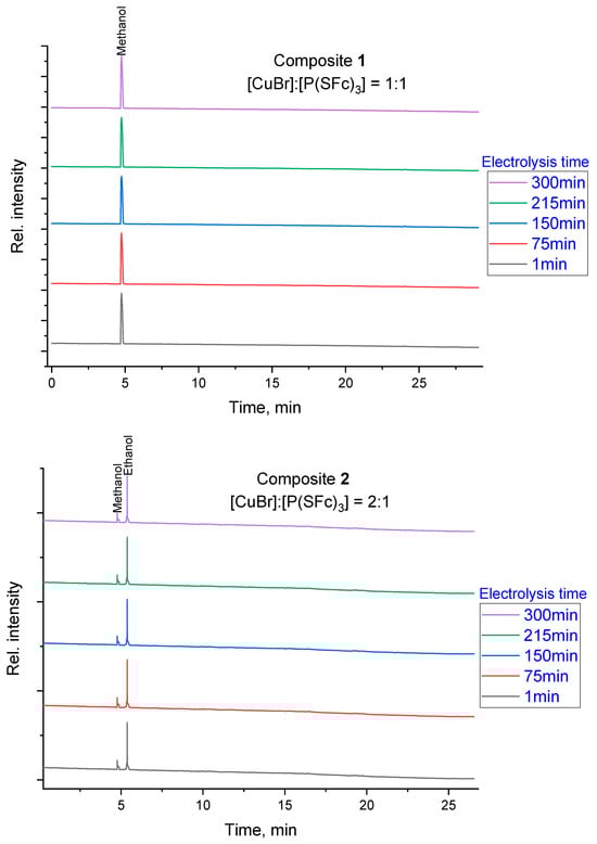 Chromatographic analysis was performed to elucidate the product distribution resulting from the electrochemical reduction of CO2 using composites 1 and 2. The analysis revealed that the product composition depends significantly on the chosen metal-to-ligand ratio. As shown in Figure 3, each chromatographic trace was normalized and vertically offset to highlight the characteristic peaks for methanol and ethanol across different electrolysis times. This qualitative visualization confirms that the catalytic system maintains its selectivity for specific alcohols throughout the duration of the test, with composite 1 favoring methanol and composite 2 favoring ethanol. Quantitative determination of product amounts was conducted using external calibration and integrated peak areas to calculate Faradaic efficiencies.