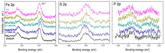 XPS spectra of Fe 2p, S 2p, and P 2p for (P(SFc)3, CuBr–(P(SFc)3 composites with molar ratios of 1:1 and 2:1, before and after CO2 electrolysis.