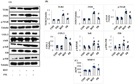 Immunoblotting analysis and quantification of TLR4, iNOS, COX-2, NF-κB, p-NF-κB, t-IκB, p-IκB, P38, and p-P38 in the striatal tissues of rats (A,B). Immunoblotting was performed in triplicate (n = 3). (C) Effect of FSL on the expressions of MMP-9 in the midbrain (n = 8) and the results are shown as the mean ± SEM (n = 8); * p < 0.05 CON vs. ROT; # p < 0.05 ROT vs. FSL + ROT (One-way ANOVA followed by DMRT). CON: normal control; FSL: farnesol control; ROT: rotenone; FSL + ROT: farnesol + rotenone.