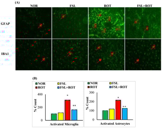 Microglia and astrocytes are the main immune cells in the brain that are considered one of the major sources of inflammatory mediators. The immunofluorescence staining of GFAP and Iba-1 showed a significant (p < 0.05) increase in the number of activated GFAP-positive astrocytes (Figure 4A) and Iba-1-positive microglia cells (Figure 4B) in ROT-injected rats when compared to the normal control group. The co-administration of FSL to ROT-injected rats showed a significant (p < 0.05) reduction in the activation of both microglia and astrocyte cells in the striatum of rats when compared to the ROT group. There was no notable expression of activated microglia and astrocyte cells in normal control rats and rats treated with FSL only.