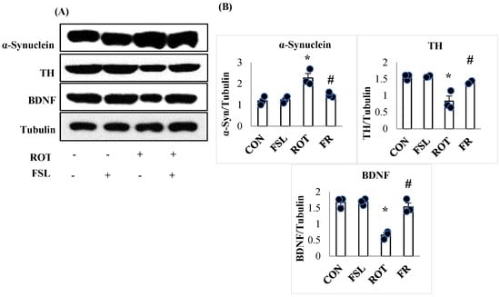 Representative images of Western immunoblots and densitometric analysis for TH, BDNF, and α-synuclein expressions in the striatal tissues (A,B). Immunoblotting analysis was performed in triplicate (n = 3). * p < 0.05 CON vs. ROT; # p < 0.05 ROT vs. FSL + ROT (One-way ANOVA followed by DMRT). CON: normal control; FSL: farnesol control; ROT: rotenone; FSL + ROT: farnesol + rotenone.