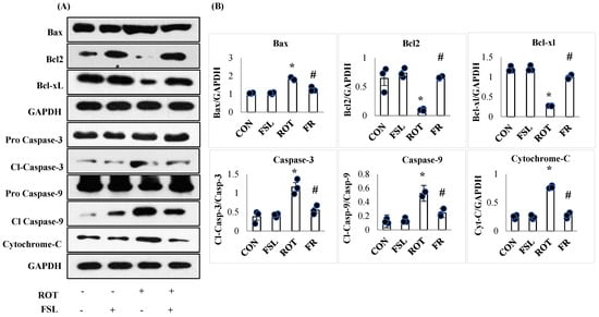 Immunoblotting and densitometric analysis of apoptotic marker proteins in the striatum (A,B). Immunoblotting was performed in triplicate, and the results are presented as the mean ± SEM (n = 3). * p < 0.05 CON vs. ROT; # p < 0.05 ROT vs. FSL + ROT (One-way ANOVA followed by DMRT). CON: normal control; FSL: farnesol control; ROT: rotenone; FSL + ROT: farnesol + rotenone.