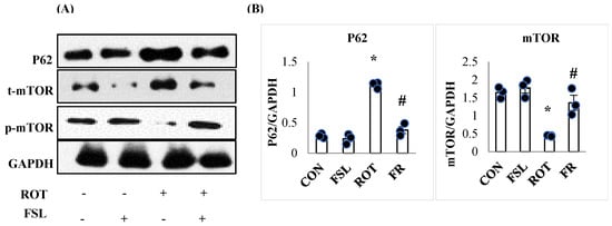 Immunoblotting and densitometric analysis of P62, m-TOR, and p-m-TOR in the striatal tissues (A,B). Immunoblotting was performed in triplicate (n = 3). * p < 0.05 CON vs. ROT; # p < 0.05 ROT vs. FSL + ROT (One-way ANOVA followed by DMRT). CON: normal control; FSL: farnesol control; ROT: rotenone; FSL + ROT: farnesol + rotenone.
