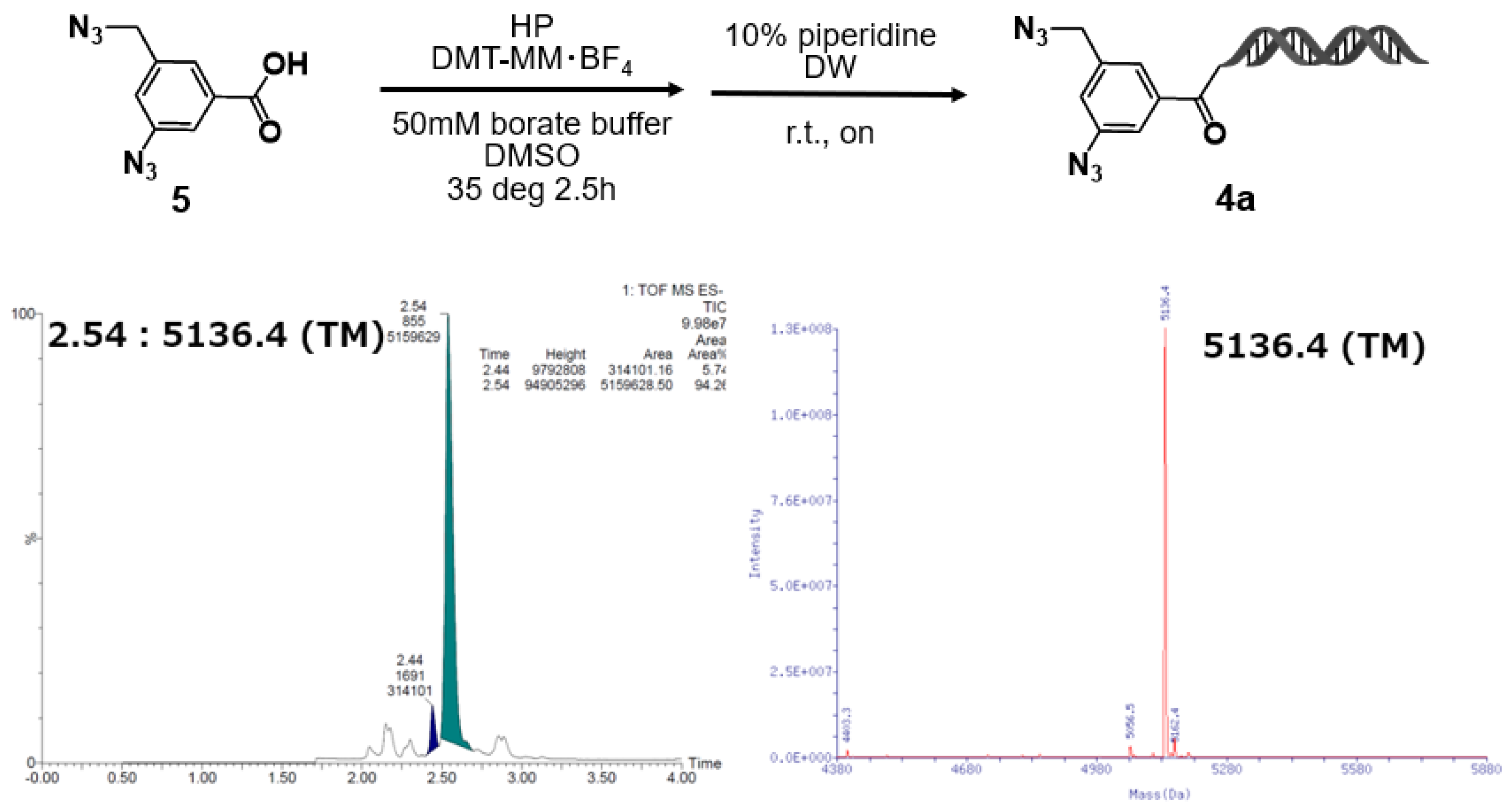 Figure 2. Synthesis of on–DNA diazide conjugate via DMTMM−mediated amidation and its LC/MS characterization. DMTMM−mediated amidation of 5 to HP followed by the removal of the DMT−adduct yielded the on−DNA conjugate. LC/MS showed the expected mass of 5136.4 (Target molecule: (TM)).