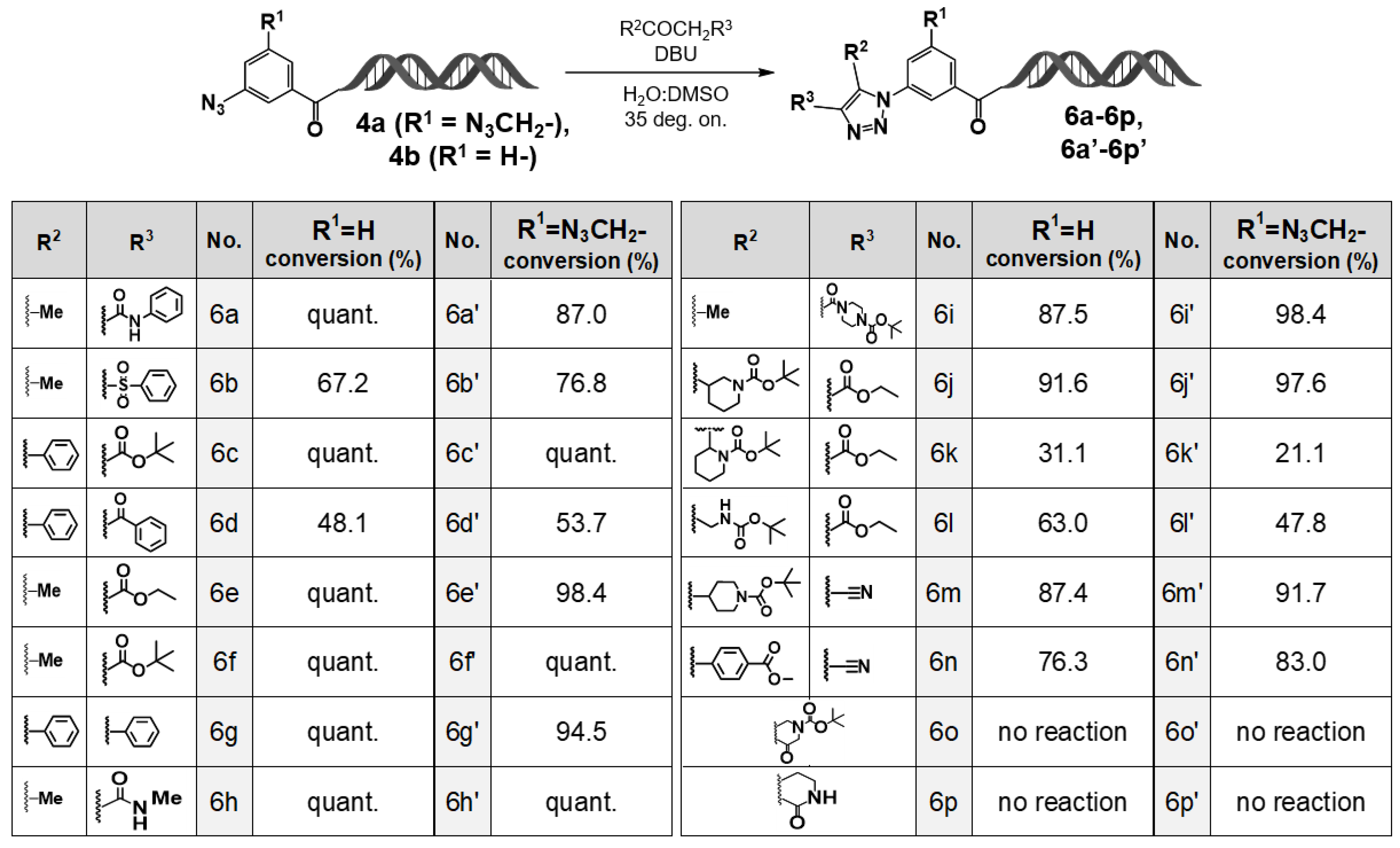 First, the reaction of 3–azidobenzoic acid–HP (4b) with active methylene compounds was conducted using 1,8–diazabicyclo[5.4.0]undec–7–ene (DBU) as the organic base catalyst at 35 deg overnight. As a result, when β–ketoamides (6a, 6h), β–ketoesters (6c, 6e, 6f), or phenylbenzyl ketone (6g) were used as substrates, the corresponding 1,4,5–trisubstituted 1,2,3–triazole derivatives were obtained quantitatively. By contrast, reactions with β–ketosulfone (6b) or 1,3–diketone (6d) afforded the desired triazole products in moderate yields.