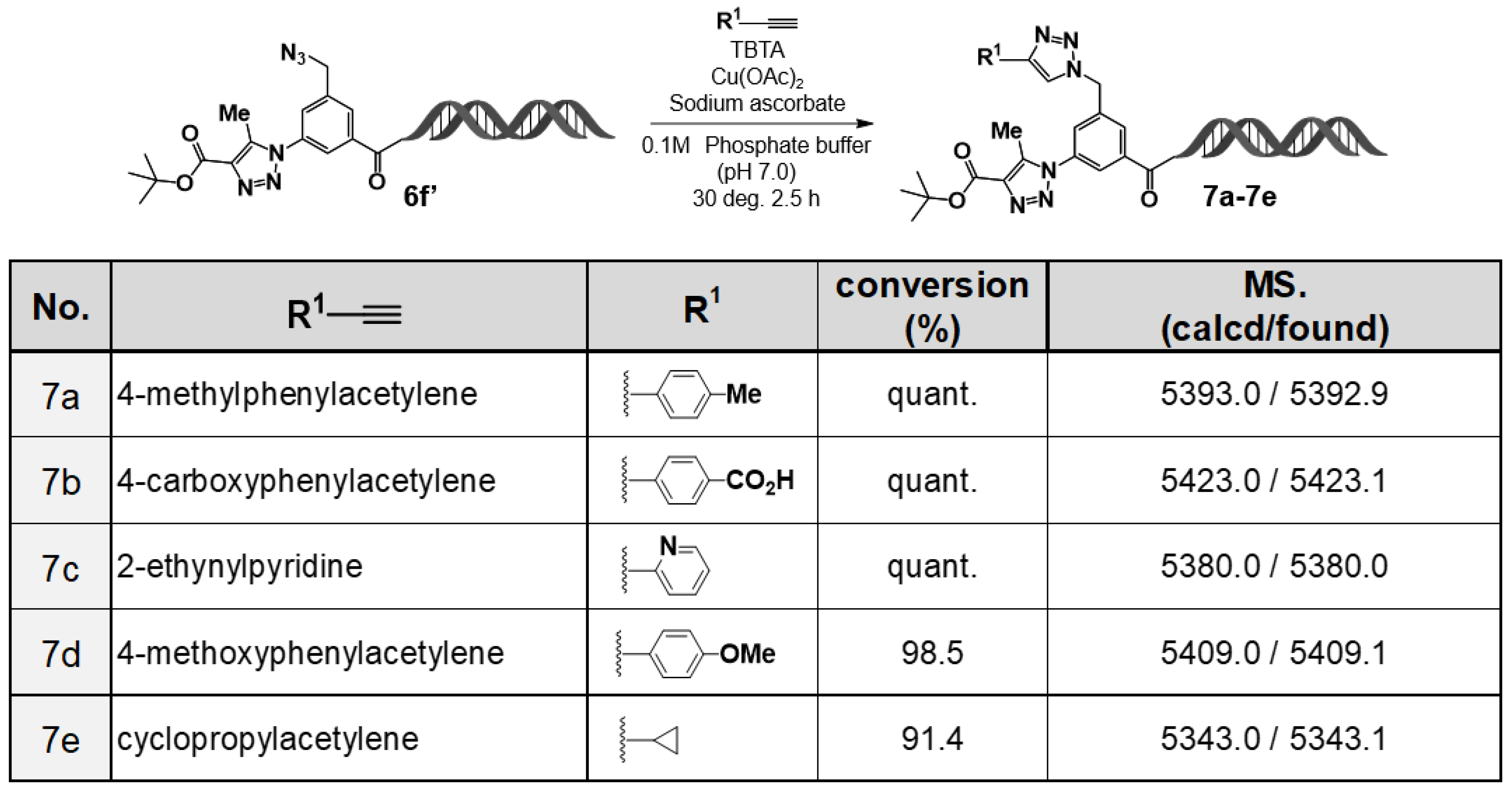 Figure 4. Sequential transformations of 3–azido–5–(azidomethyl)benzoic acid–HP via double click reactions. Substrate scope of the on–DNA CuAAC transformation using acetylene derivatives (7a7e) and corresponding LC/MS confirmation. CuAAC of the on–DNA azide with acetylenes 7a7e was performed under standard conditions. LC/MS confirmed high conversions and the expected masses (calcd/found).