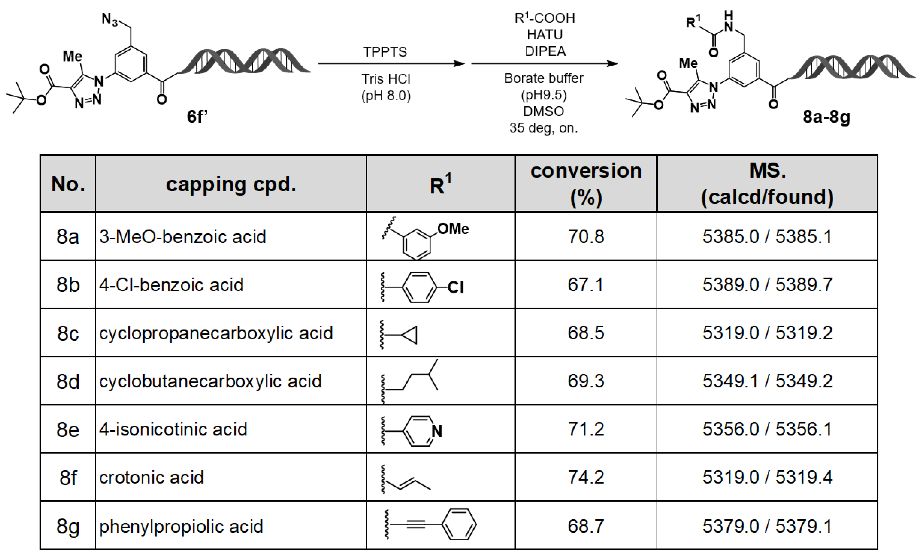 Figure 5. On–DNA HATU–mediated amidation with carboxylic acids: capping diversity and LC/MS–confirmed conversions (8a8g). On–DNA amidation (capping) with carboxylic acids 8a8g was performed under HATU/DIPEA conditions. LC/MS confirmed conversions and expected product masses.
